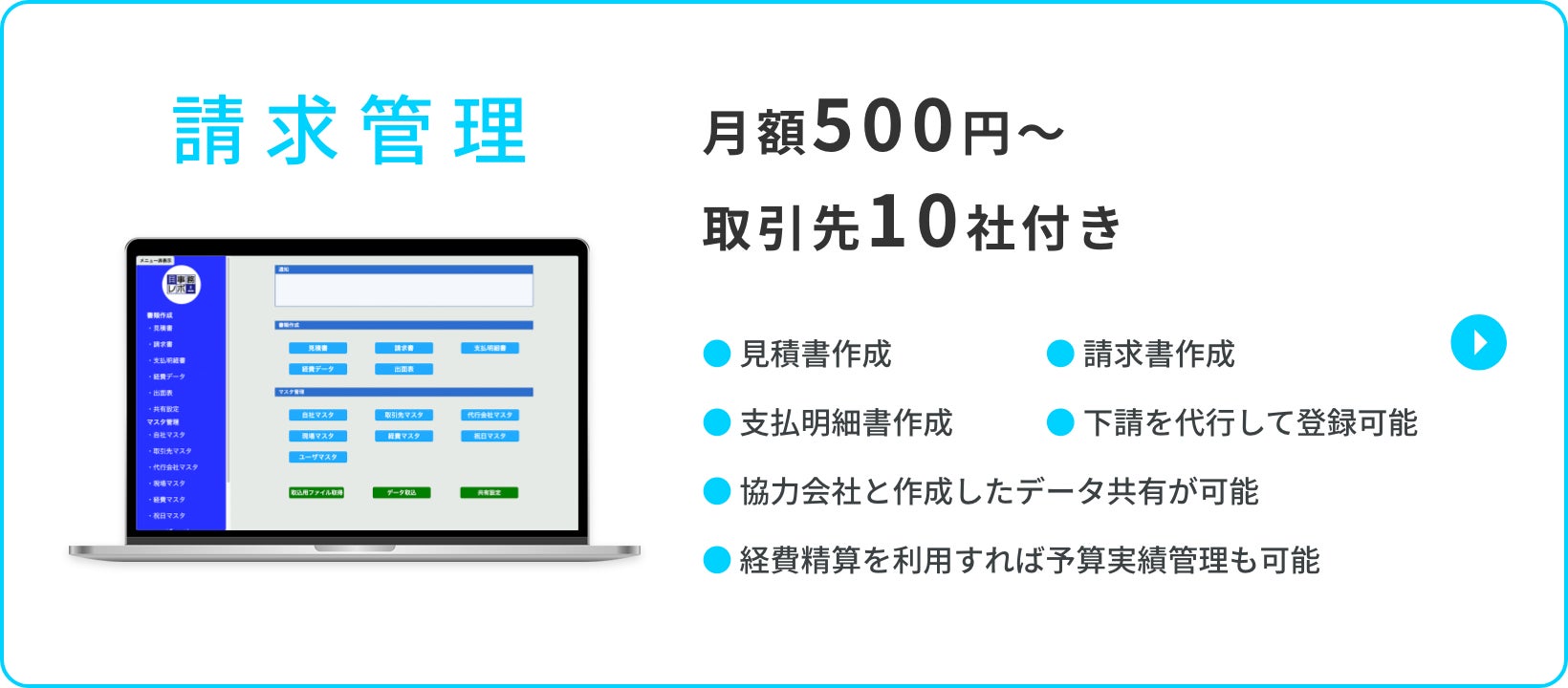 近年、様々なクラウドサービスの開発・進化が目まぐるしいですが、「請求支払業務」、「経費精算」、「資格管理」に特化し、中小建設事業者で扱える操作性・価格を実現させるため、10年以上の事務経験から独自に開発しました。