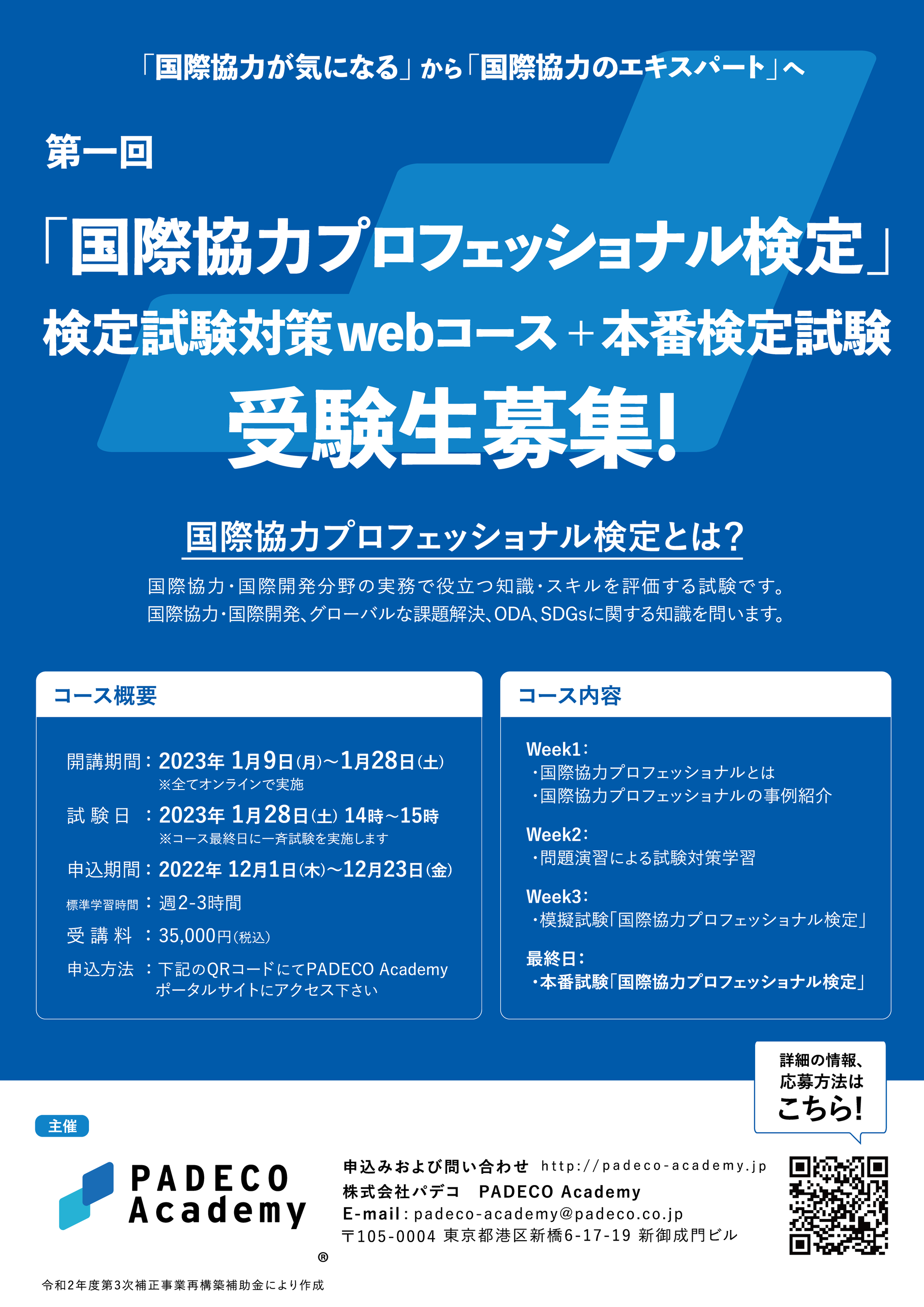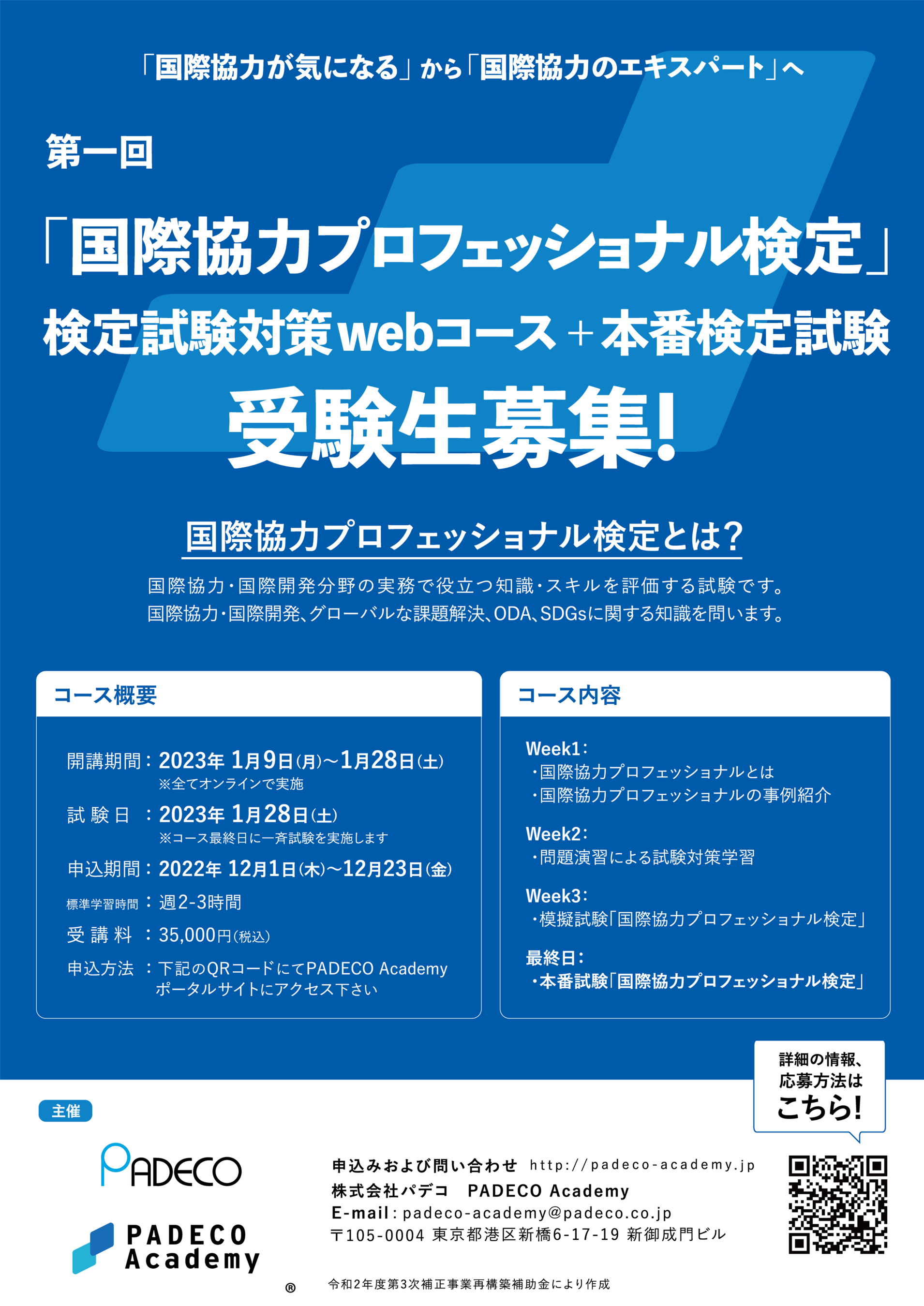第一回「国際協力プロフェッショナル検定」検定試験対策Webコース+本番検定試験を12月23日(金)まで申込受付中