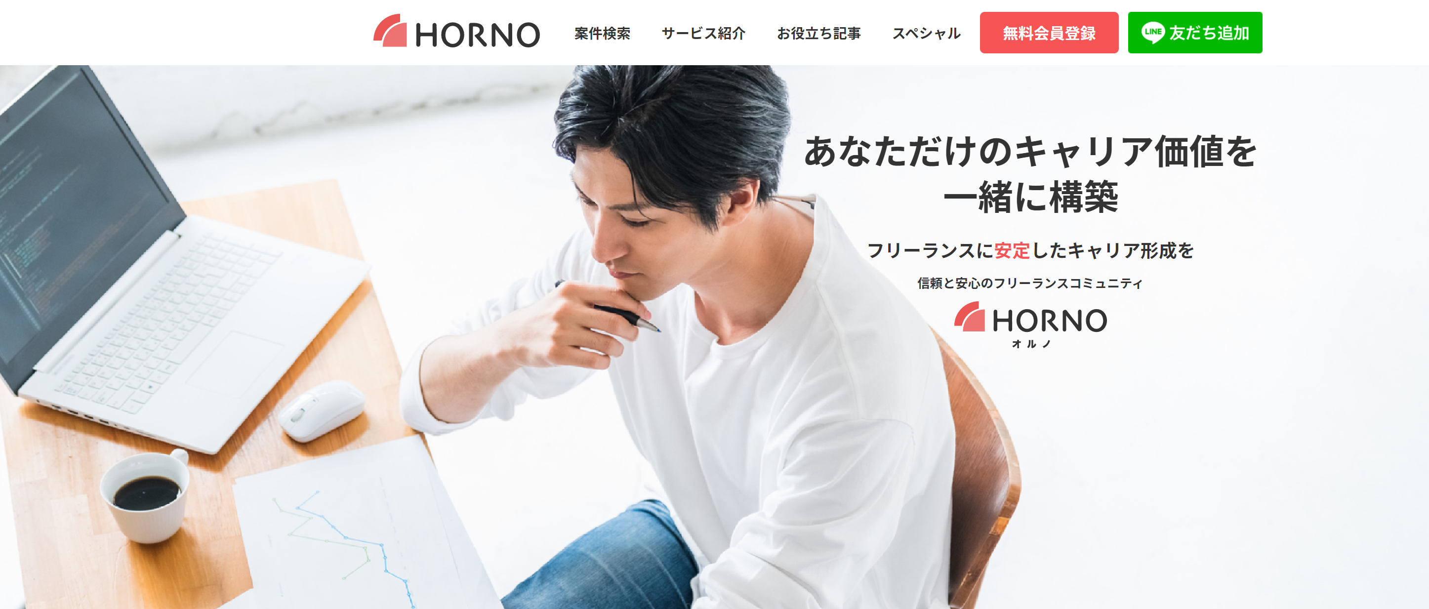 フリーランスの皆様は「仕事の継続性」という面からみると収入面含め安定性に不安を感じている方も多くいらっしゃるかもしれません。一方で着実に一つ一つのプロジェクトで顧客の信頼感を勝ち得て、自分自身のスキルを身につけていけば、キャリアが形成され、安定した活動とそれに伴う収入も十分受け取ることが出来るようになります。変化の激しい現代においてこの「成長=安定したキャリアの形成」という視点を身につけることが、今後のフリーランスの皆様の人生設計戦略において不可欠であると考えており、HORNOではそのような皆様に対してサポート致します。