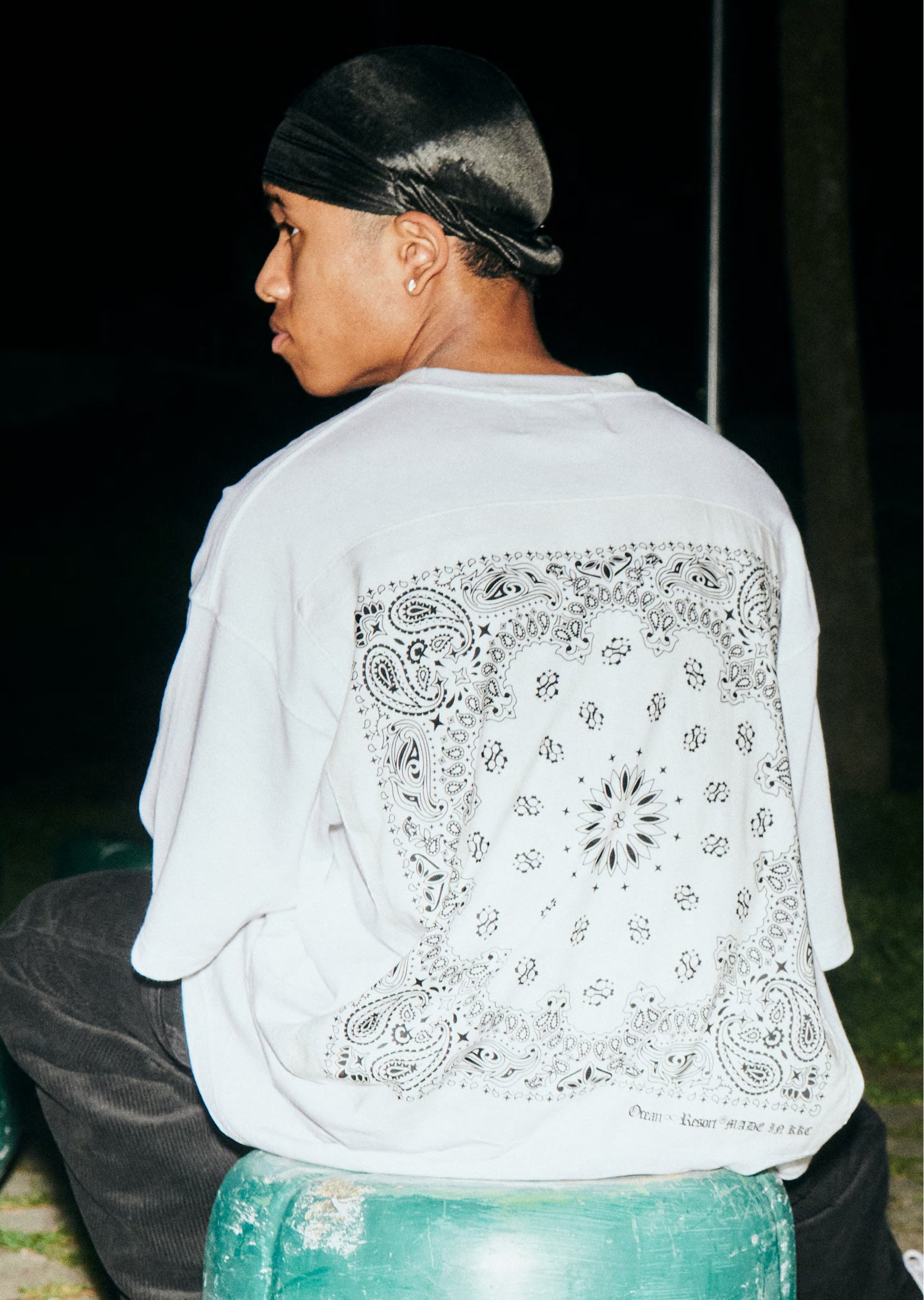 「バンダナTシャツ」は、フロントのアイコニックなロゴ刺繍とバックスタイルに縫い付けたオリジナルバンダナが印象的なデザイン。「フロッキーTシャツ」は、シャリ感のある超極厚生地にフロント・バッグスタイルともに大胆にフロッキープリントを施しました。「ピスTシャツ」は、フロントのポケットとバックスタイルのオリジナルピスがアクセントになり、バランスで遊べる逸品です。サイズは全てLとXLで展開します。