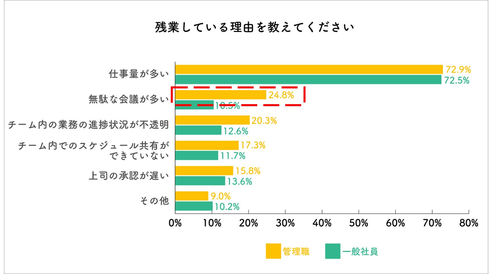 ■残業している理由「無駄な会議」、「チーム内での情報共有不足」!
