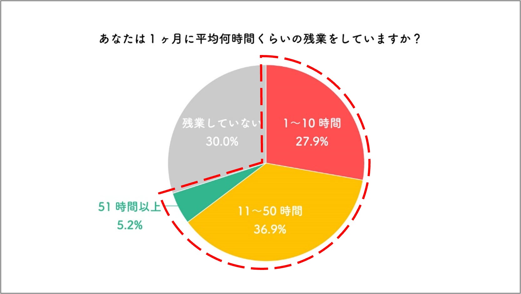 1ヵ月の残業時間を聞いたところ、1時間~10時間が27.9%、11時間~50時間が36.9%、また、51時間以上が5.2%という結果になり7割の人が残業をしていると回答。まだまだ多くの人が残業をしていることがわかりました。(n=1020)