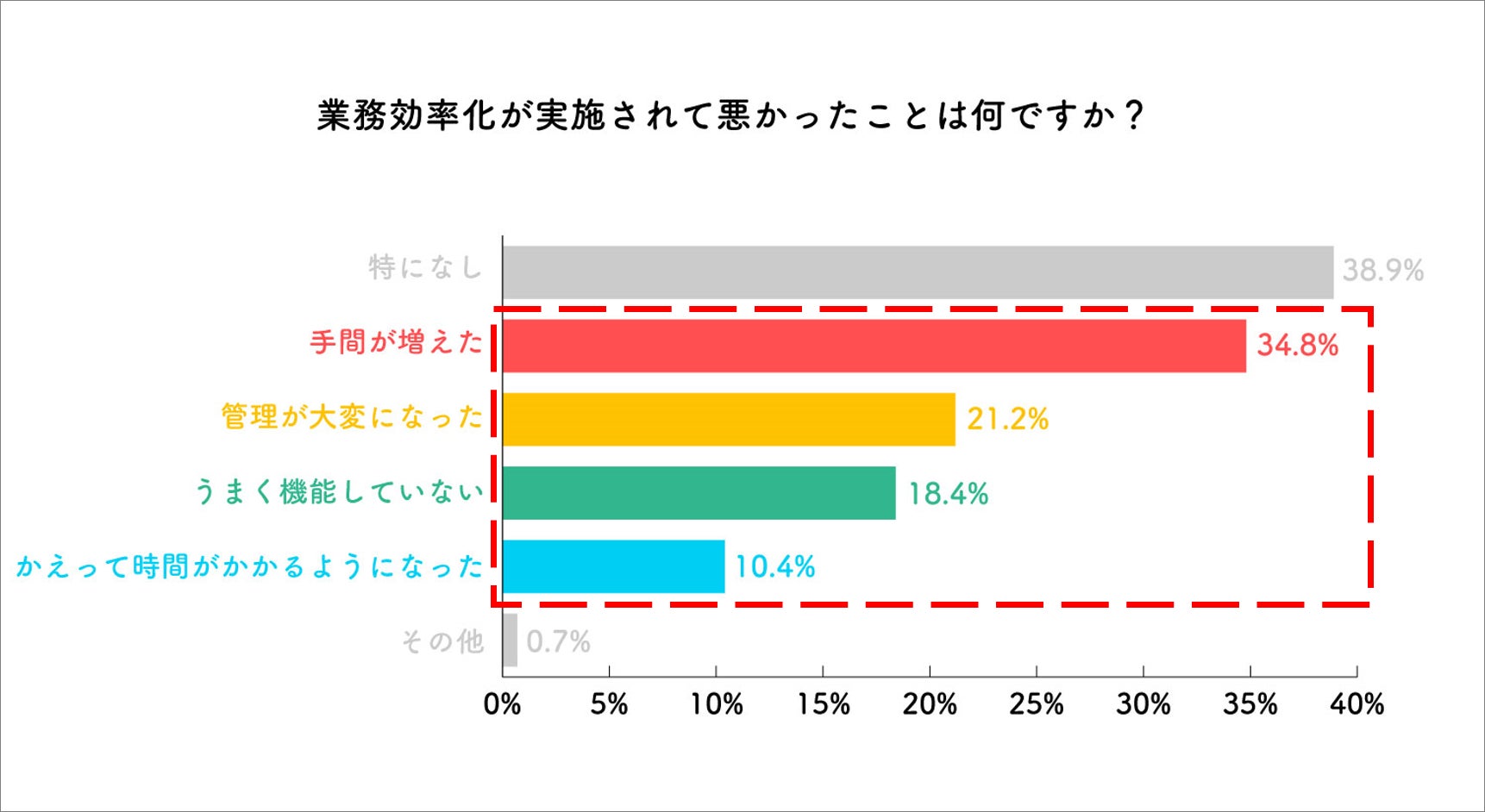逆に業務効率化が実施されて悪かったこととしては「手間が増えた」34.8%、「管理が大変になった」21.2%、「うまく機能していない」18.4%、「かえって時間がかかるようになった」10.4%という結果になりました。