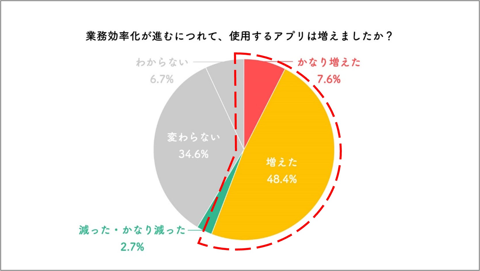 今回の調査結果から、会社が業務効率化に取り組んでいないと感じている人が約6割いることがわかりました。その理由として、業務効率化を進めたいが人材や費用面で、会社側が積極的になれない事情があるようです。一方、業務効率化を進めている企業に勤務している方の中でも、約6割が業務効率化のために使用するアプリが増加したと回答し、34.8%が「手間が増えた」と回答しています。業務効率化を進める会社の中に、かえって非効率な一面がでているということが浮き彫りになりました。