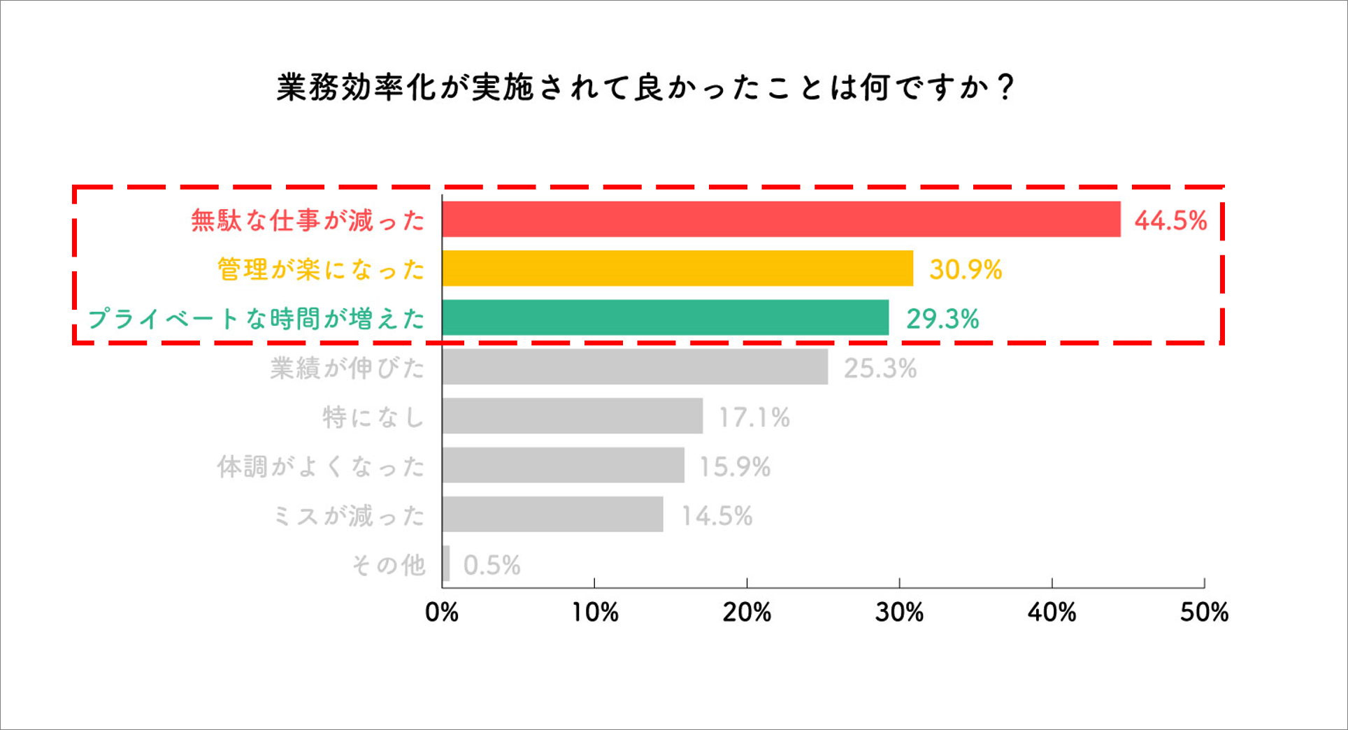 業務効率化が実施されて良かったこととしては「無駄な仕事が減った」44.5%、「管理が楽になった」30.9%、「プライベートな時間が増えた」29.3%となり、業務を効率化することで、仕事・プライベートともに充実した生活ができているようです。(n=434)