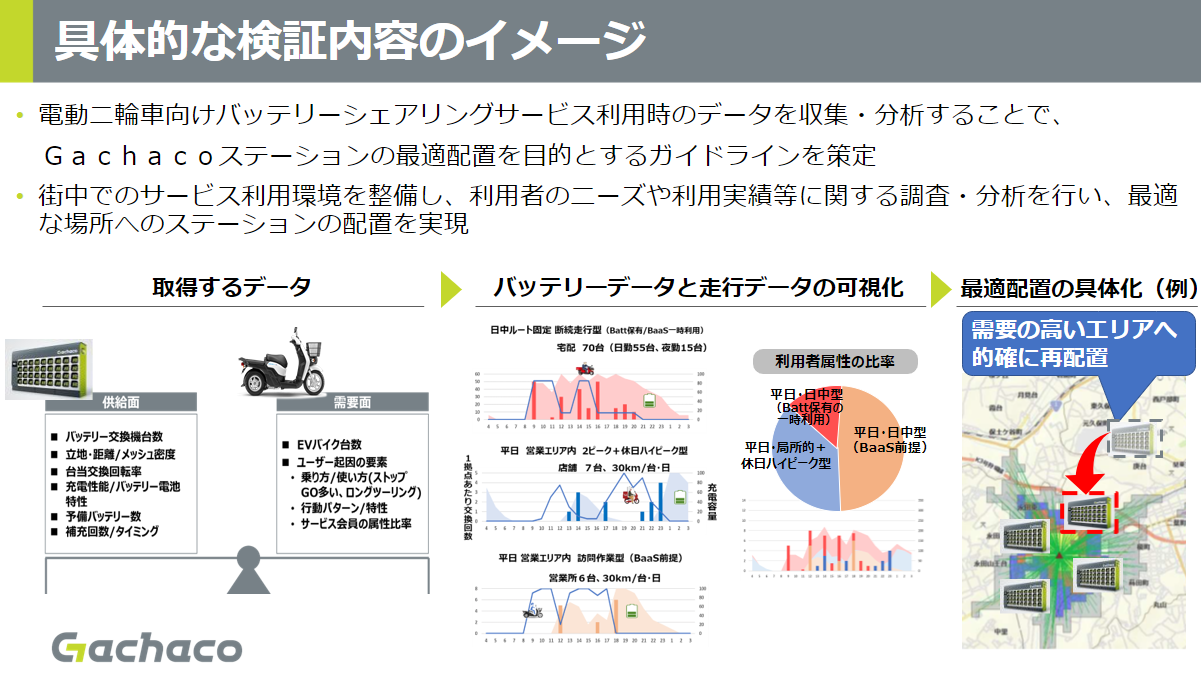 本実証事業では、電動二輪車向けバッテリーシェアリングサービス利用時のデータを収集・分析することで、ステーションの最適配置を目的とするガイドラインを策定いたします。
