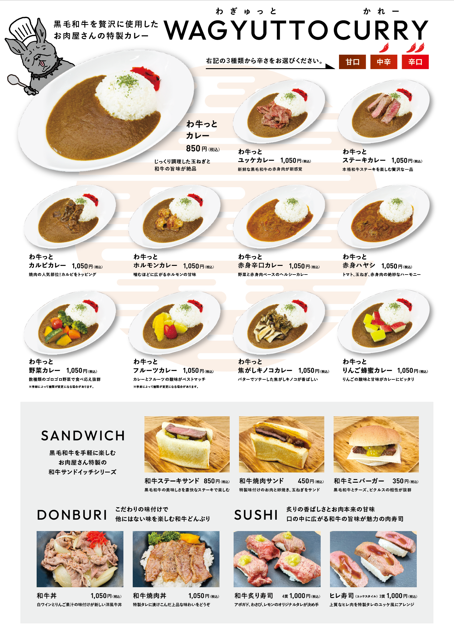 メニューは、オープン当初からご好評いただいている黒毛和牛を贅沢に使った特製和牛カレーなど、和牛をお手軽に楽しめるラインナップをご用意しております。