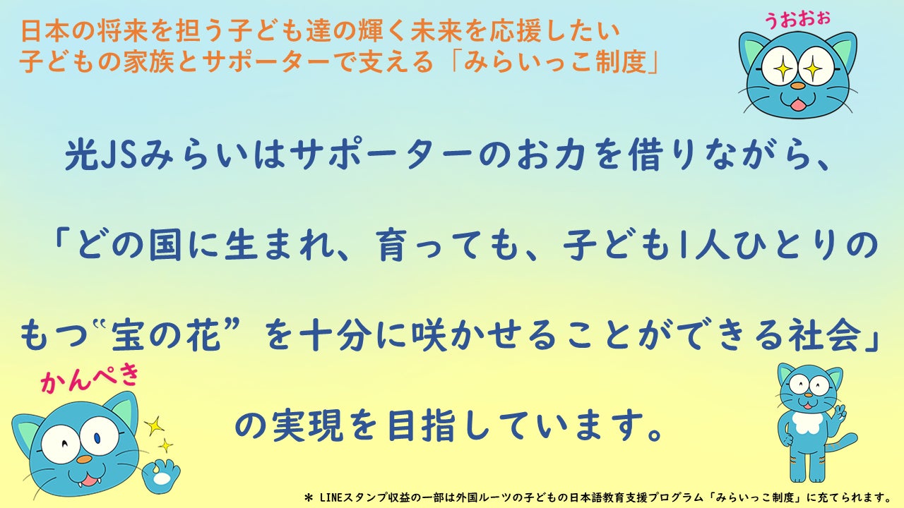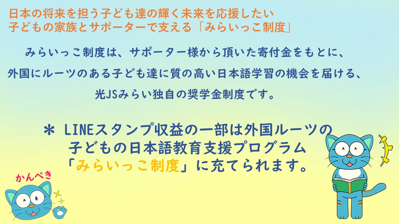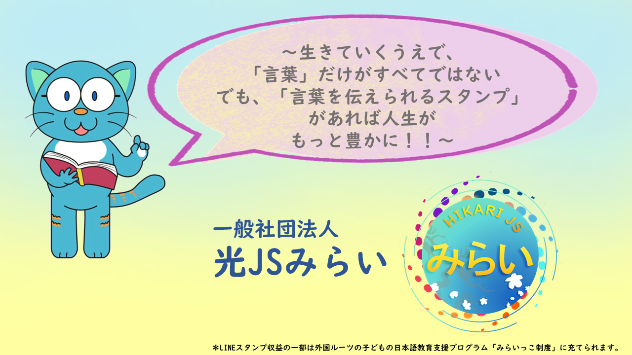 外国にルーツのある子どもたちに日本語を学ぶ場を提供している一般社団法人光JSみらい(東京都大田区、代表 梅本祥子、以下「光JSみらい」)は、当法人オリジナルキャラクターである「みらい~にょ」のLINEスタンプを販売開始しましたので、お知らせいたします。