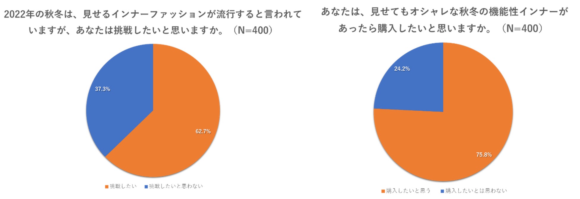 このようなトレンドのファッションスタイルに挑戦したいか調査したところ、60%以上の人が「挑戦したい」と回答し、さらに、“見せるインナー”として活用できる秋冬の機能性インナーがあれば購入したいと回答する人は75%を超える結果となりました。