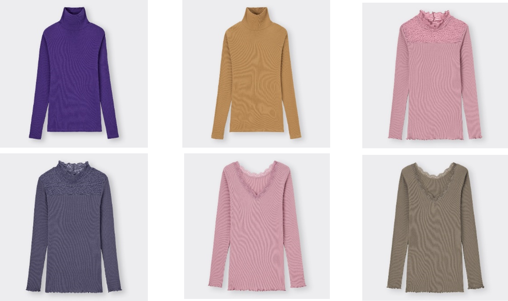 今年は3つのデザインタイプより、マスタード、パープル、ピンク、ブルー、オリーブの5色が新登場しました。暗くなりがちな冬のコーディネートの差し色としても使える豊富なカラーバリエーションと、見せてもおしゃれなデザインで毎日のコーディネートの幅も広がり、寒い冬でもファッションを楽しんでいただけます。また、ジーユーのスタイルヒートは使いやすいベーシックタイプで690円、レイヤードコーデにも活躍するデザインタイプで990円とお手頃な価格でお買い求めいただけます。