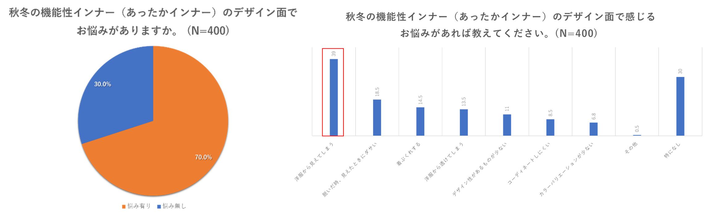 秋冬の機能性インナーのデザイン面でのお悩みを調査したところ、「悩みがある」と回答した人は70%に上りました。中でも、「洋服から見えてしまう」と回答した人は約40%と最も多く、続いて「服を脱いでインナーが見えたときにダサく感じる」といった回答が約20%となり、ファッションと上手くマッチせずに悩んでいる方が多いことが分かりました。