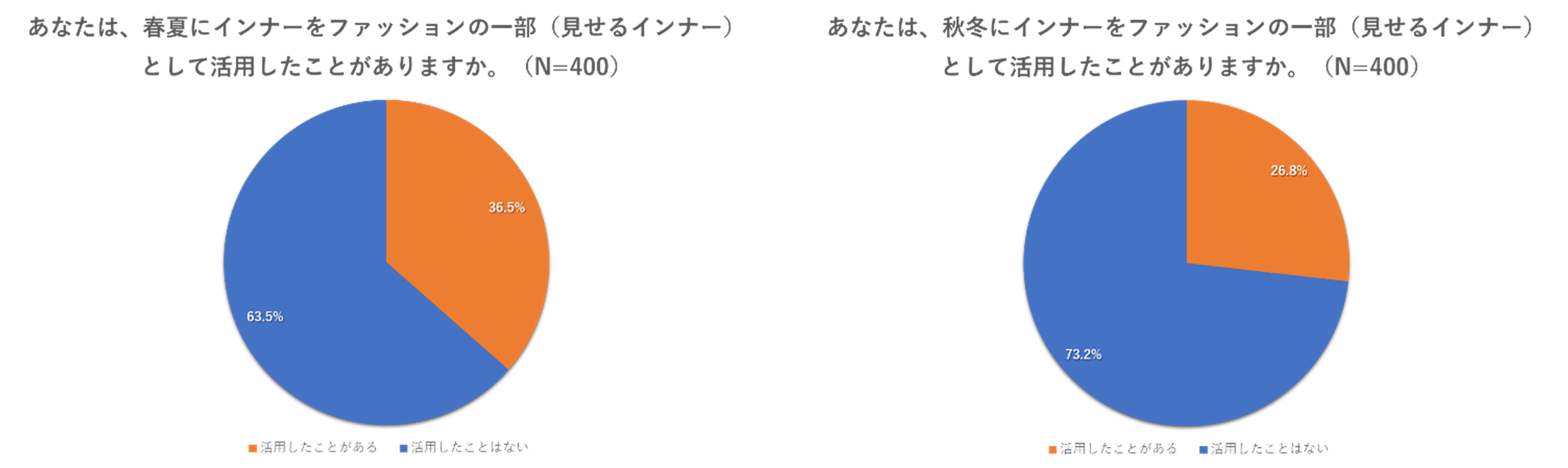 前項の調査にて、インナーとファッションがマッチせずに悩んでいる方が多いことを受け、インナーを“見せるインナー”としてファッションの一部に取り入れたことがあるか、春夏・秋冬のインナーで比較調査したところ、春夏のインナーを“見せるインナー”として活用したことがある人は約40%だったのに対し、秋冬のインナーを“見せるインナー”として活用したことがある人は、約30%となり、約10%差があることが分かりました。春夏と比べて、秋冬のインナーは“隠すもの”と考えている方が多いのかもしれません。