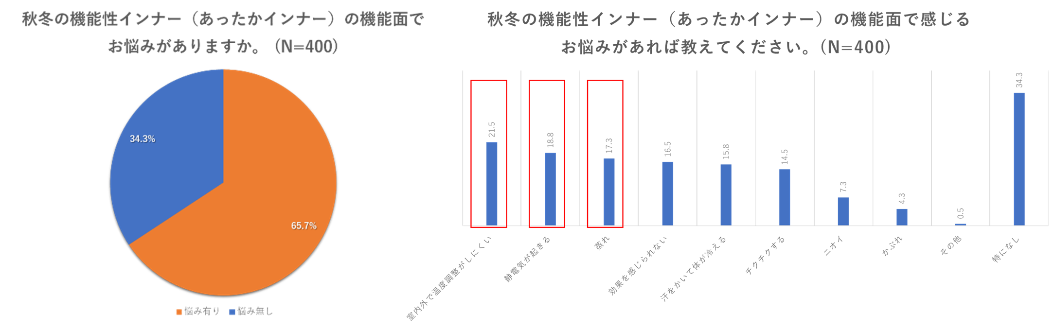 秋冬の機能性インナー着用における機能面でのお悩みを調査したところ、65.7%の人が「悩みがある」と回答し、中でも「室内外の温度調整しにくい」と回答する人が最も多く、その他「静電気が起きる」「蒸れを感じる」といった回答が上位を占めました。保温機能以外に関するお悩みが多くを占める結果となり、あたたかさだけでなく快適に着用するための機能が求められていることが分かりました。