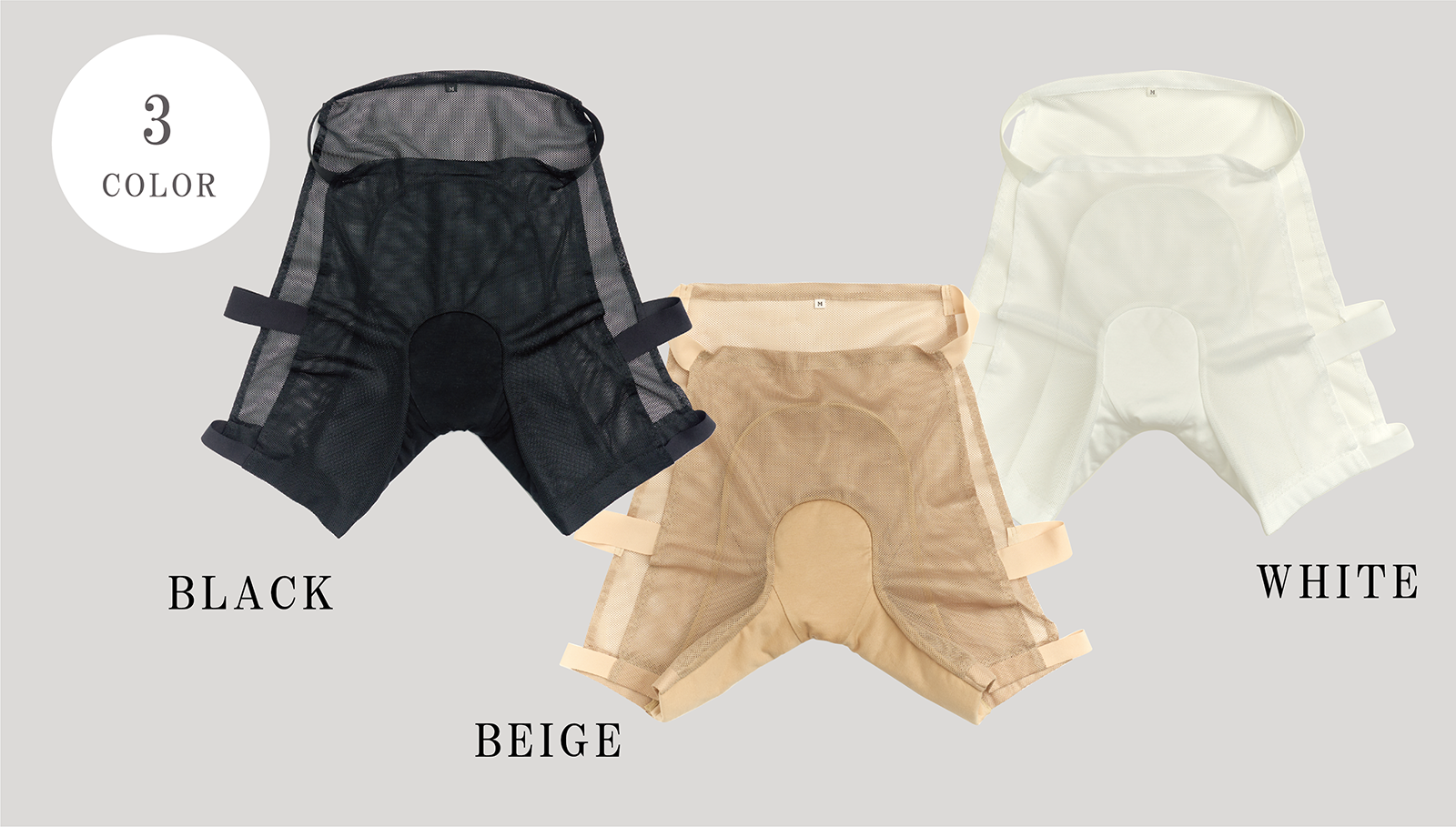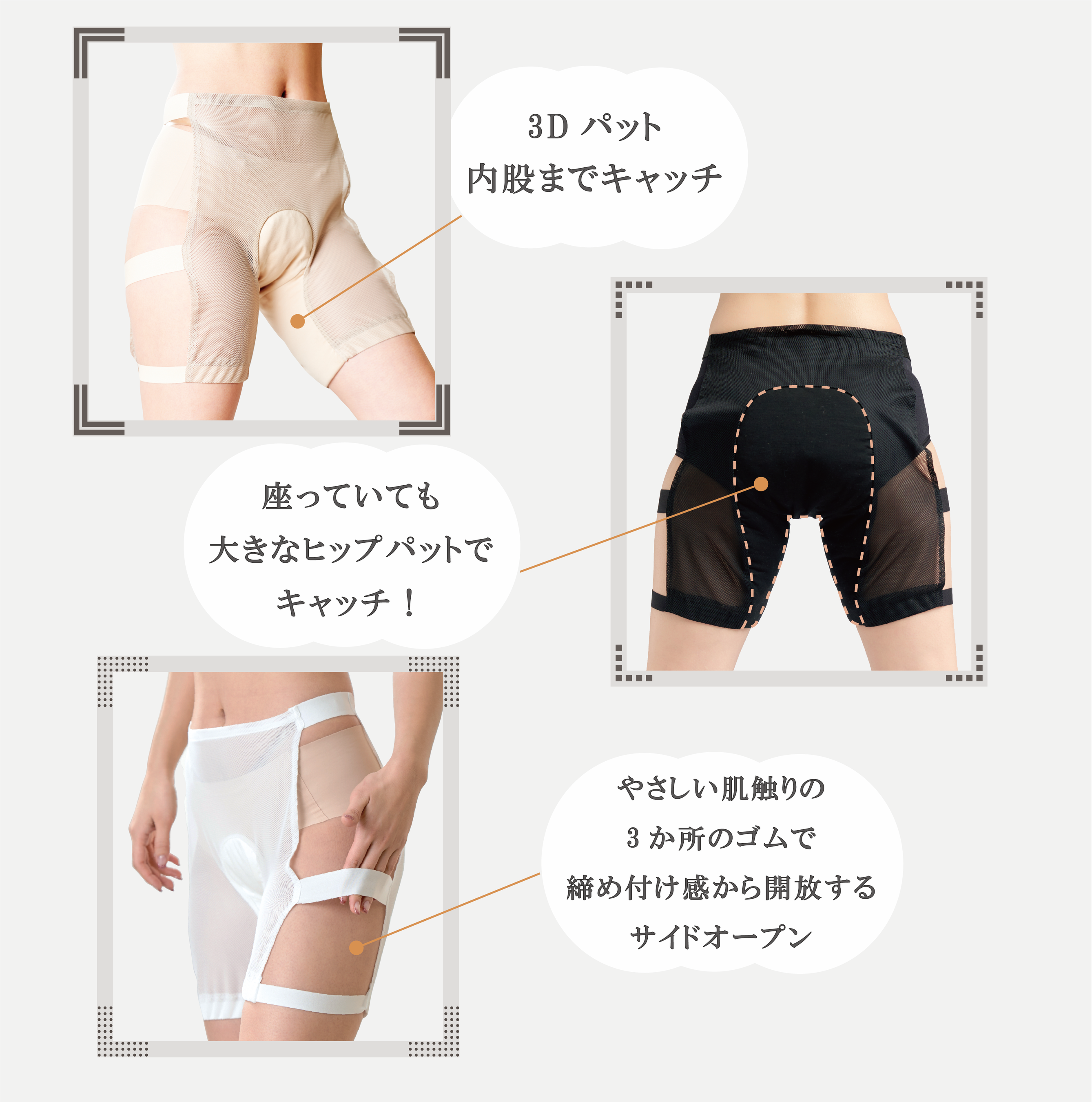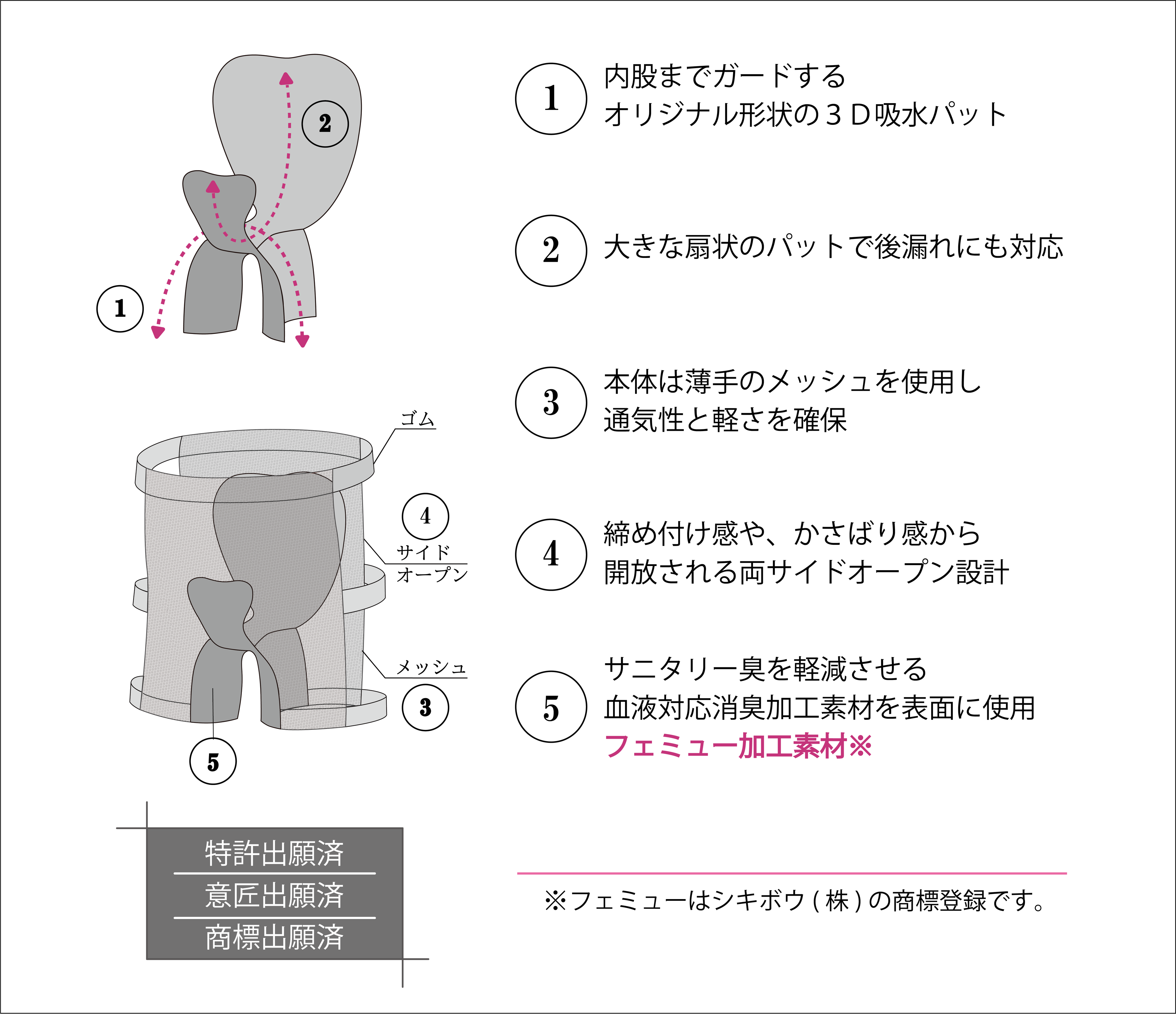 ① 内股までカバーするオリジナル形状の3D吸水パット