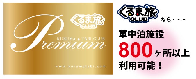 レンタルキャンピングカーおよび社用キャンピングカーに「くるま旅クラブのプレミアム特典」を付帯。くるま旅クラブWEBサイトに掲載中の車中泊施設『RVパーク』『くるま旅パーク』『湯YOUパーク』『ぐるめパーク』『民パーク』など、全国800ヶ所以上の車中泊利用が可能です。
