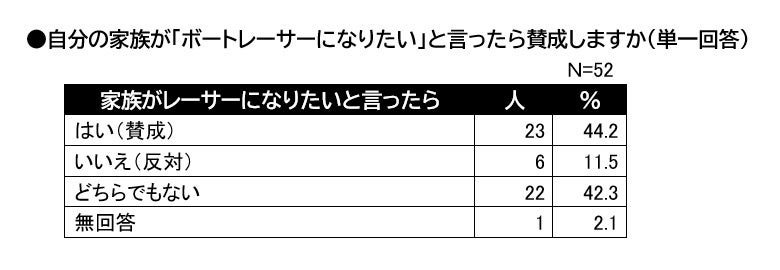 最後に、女子レーサーが目標とする「一流のボートレーサー像」について聞きました。一流に必要な条件は、約6割が「安定してよい成績」(31人)を挙げました。確かな実力があれば、タイトルや賞金は後からついてくるということでしょう。次いで「選手仲間や関係者からの信頼」(24人)、「ファンからの支持・人気」(20人)です。ボートレーサーとして仕事ができるのは、周囲の支えがあってこそというプロフェッショナルの自覚がうかがえました。