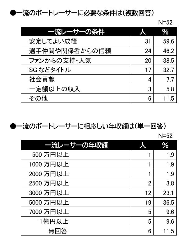 「一流のボートレーサーに相応しい年収額」は、「5千万円以上」(19人)が最も多く、次いで「3千万円以上」(12人)でした。