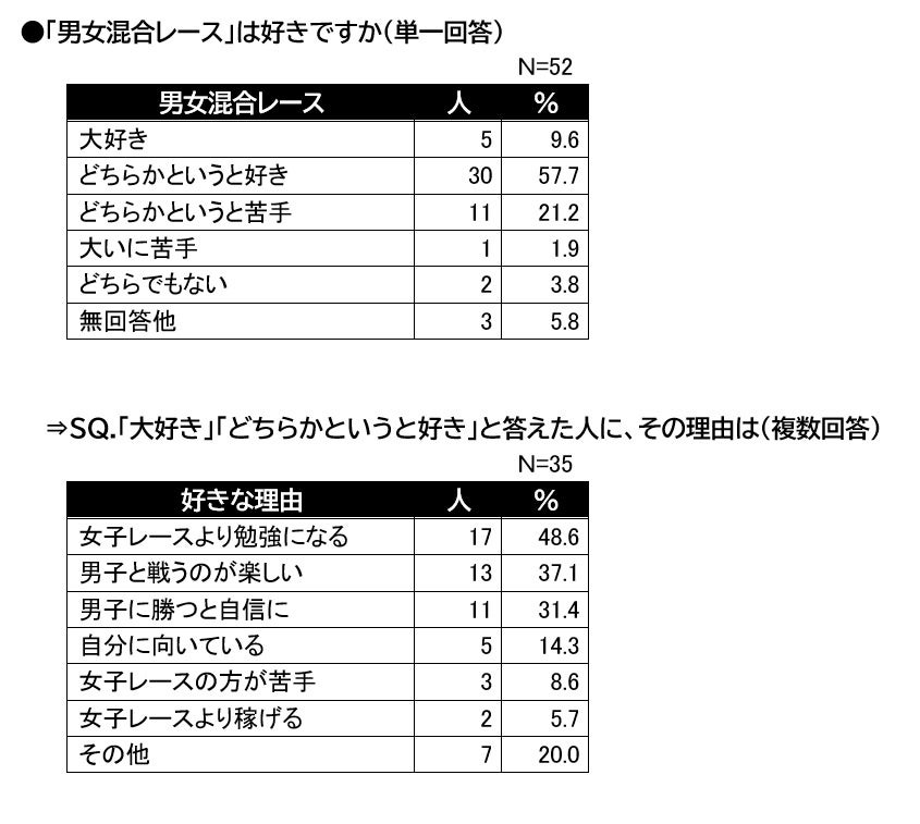 「男女混合レースは好きか」とたずねたところ、「大好き」(5人)と「どちらかというと好き」(30人)が合わせて7割近くとなりました。「男女混合レースが好きな理由」は、「女子レースより勉強になる」(17人)、「男子と戦うのが楽しい」(13人)、「男子に勝つと自信になる」(11人)などでした。男子との実力差を感じながらも、強い相手と戦うことを意欲的に楽しんでいることがうかがえます。