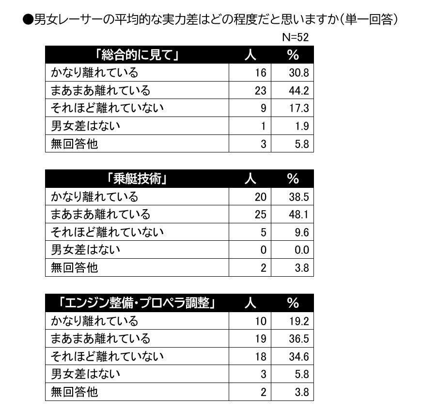 エンジン整備・プロペラ調整についても、「かなり離れている」(10人)と「まあまあ離れている」(19人)が半数以上でした。しかし、「それほど離れていない」(18人)と「男女差はない」(3人)も合わせて4割で、乗艇技術ほどの差は感じていないようです。