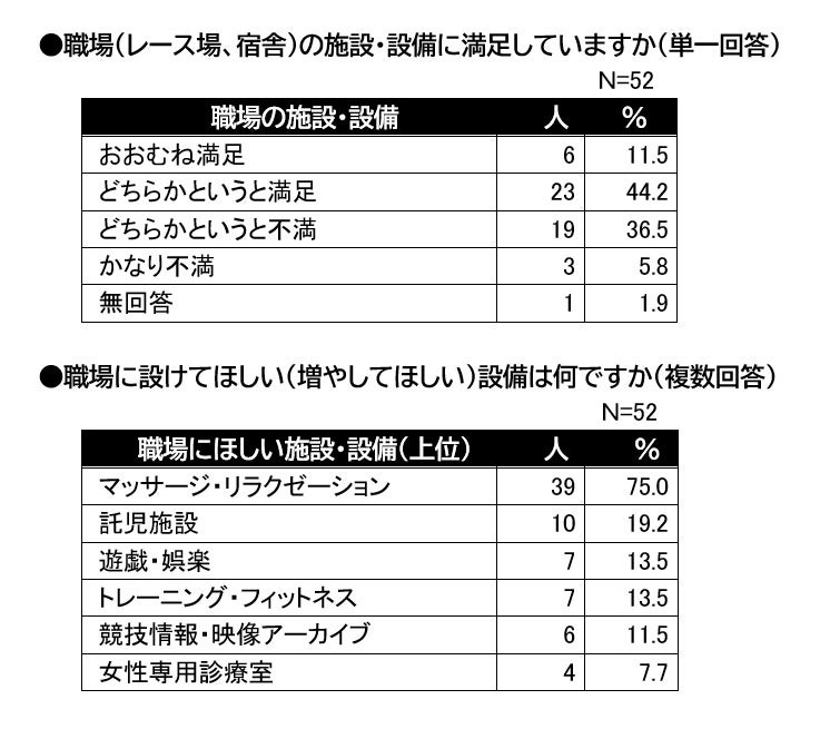 ボートレーサーは性別や年齢に関係なく、出場期間中はレース場と宿舎に滞在します。女子レーサーたちは不便を感じずに働けているのでしょうか。「職場の施設・設備に満足しているか」を聞いたところ、「おおむね満足」(6人)と「どちらかというと満足」(23人)が合わせて約56%、「どちらかというと不満」(19人)と「かなり不満」(3人)が約42%で、満足派がやや上回りました。