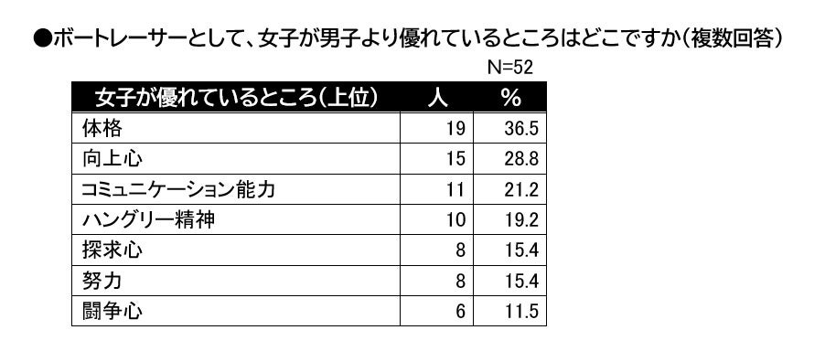それ以外では「向上心」(15人)や「ハングリー精神」(10人)など、メンタル面に関するものが上位にきました。ハートの強さでは男子に負けません。「コミュニケーション能力」(11人)も女子の強みのようです。水の上ではライバルですが、陸の上では職場の同僚。互いにアドバイスしたり、作業を手伝ったりと、仕事ができる女子は人付き合いも上手なのでしょう。
