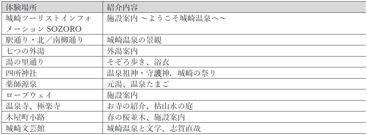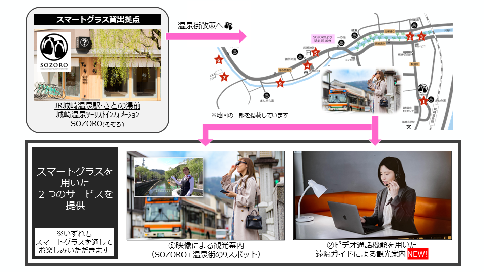 城崎ツーリストインフォメーションSOZORO(そぞろ)および温泉街10スポットの動画コンテンツによる紹介と、現役バスガイドによる観光案内を体験いただけます。