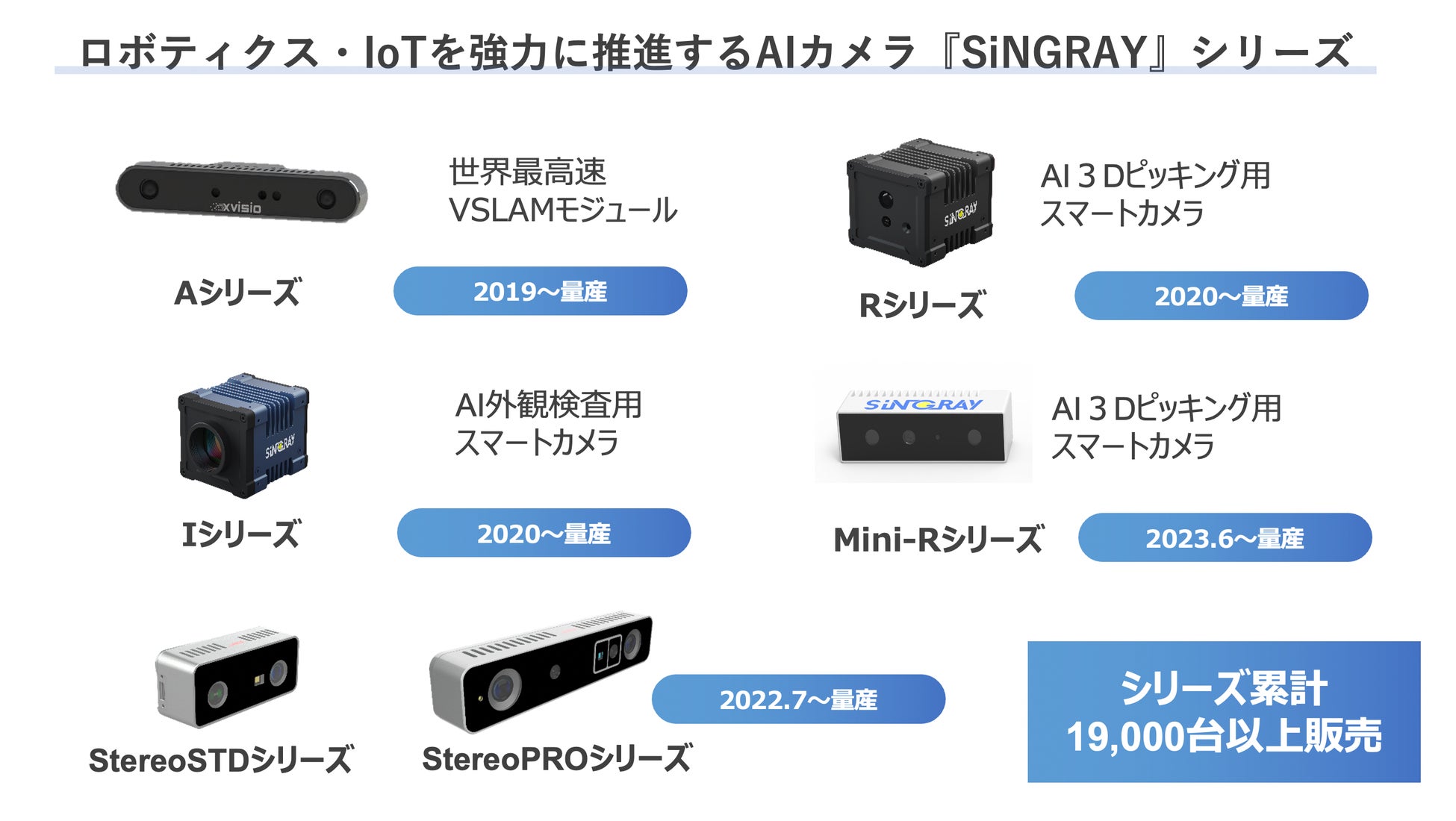 福岡で2018年の創業後リリースした当シリーズは、StereoPROの先代機種のVSLAMモジュール『SiNGRAY Aシリーズ』 を皮切りに、ロボットピッキング用カメラ、外観検査用カメラ、ARグラスとラインナップを広げ展開しています。各種産業用及び家庭用ロボットや無人搬送車(AGV)、工場内自動検査設備に視覚センサとして使用され、累計19,000台以上の販売実績を誇ります。