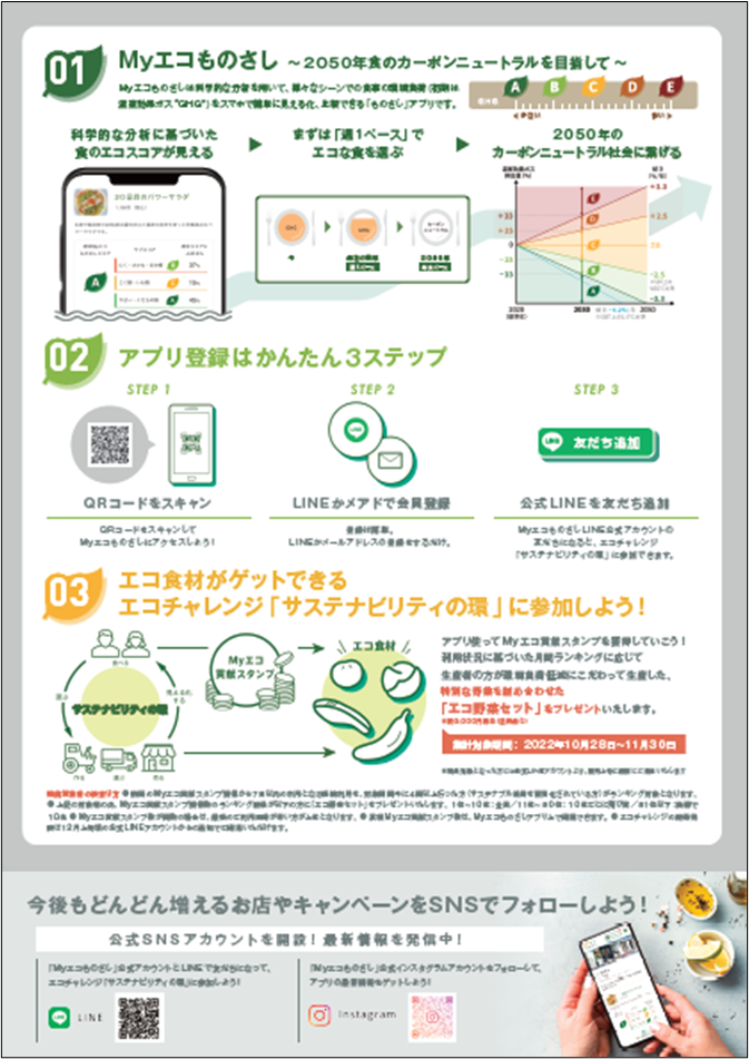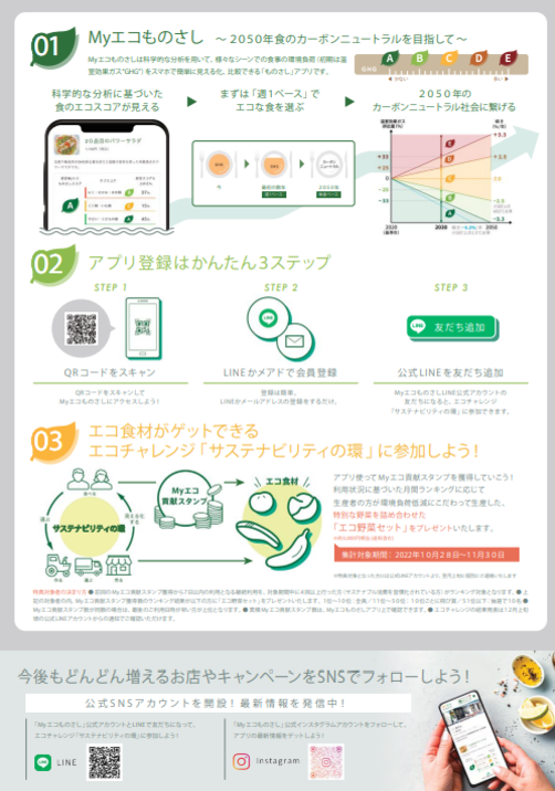 「Myエコものさし」は飲食事業者や生産者から提供されるデータと国際規格に沿った科学的な分析を組み合わせて、様々なシーンでの食事の環境負荷をスマートフォンで簡単に見える化、比較できる「ものさし」として使えるWebツールです。「Myエコものさし」を使うことにより、消費者は、環境負荷の低いメニューや食材を提供する店舗を、無料で簡単に調べることができます。利用に応じて「Myエコ貢献スタンプ」をためることができ、サステナブルな食習慣を無理なく継続、楽しみながら地球環境に貢献することができます。