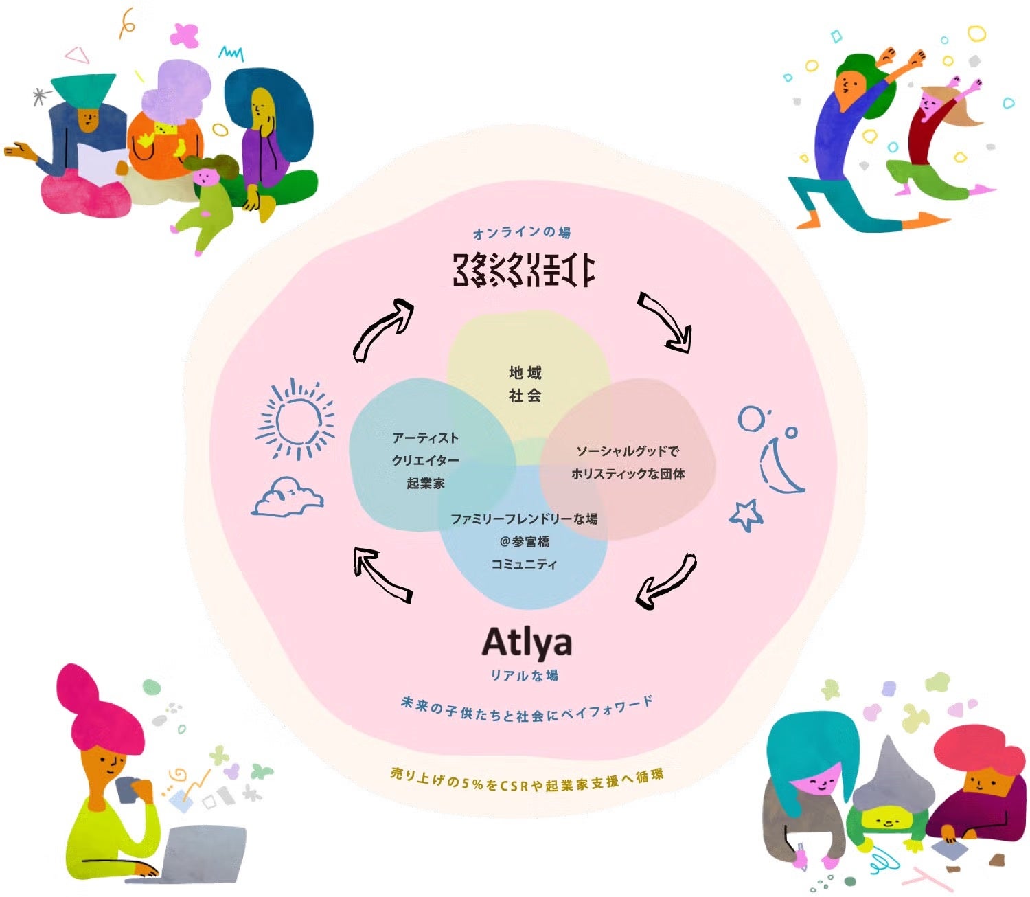 当社は、2018年4月に「私を生きる」を企業理念に、東京都渋谷区参宮橋に コ・クリエーションラウンジ「Atlya参宮橋 / tsugugoto cafe アトリア参宮橋 / ツグゴトカフェ 」をオープンしました。また、2022年11月にはオンライン上のセルフ コンディショニング プラットフォーム「ワタシクリエイト ROOM」を発足しました。