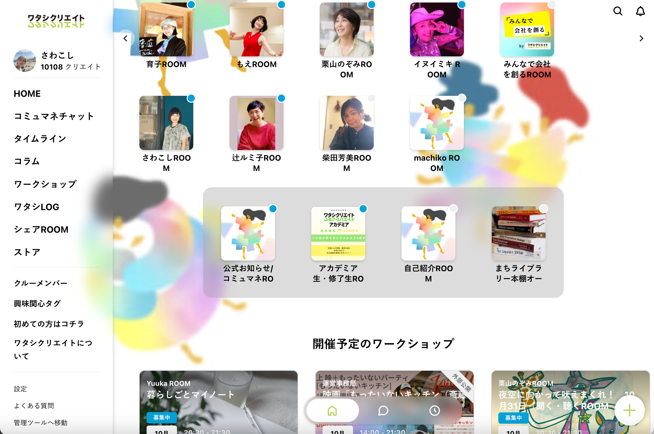 オンライン上のコミュニティ「ワタシクリエイトROOM」では月間30以上のWSを開催。自分のあり方を社会規範や常識などの外軸に合わせるのではなく、内面から湧き上がる自発的な動機で ”私を生きる” ために、自らを振り返りつつ整える セルフコンディショニング プラットフォームとして展開