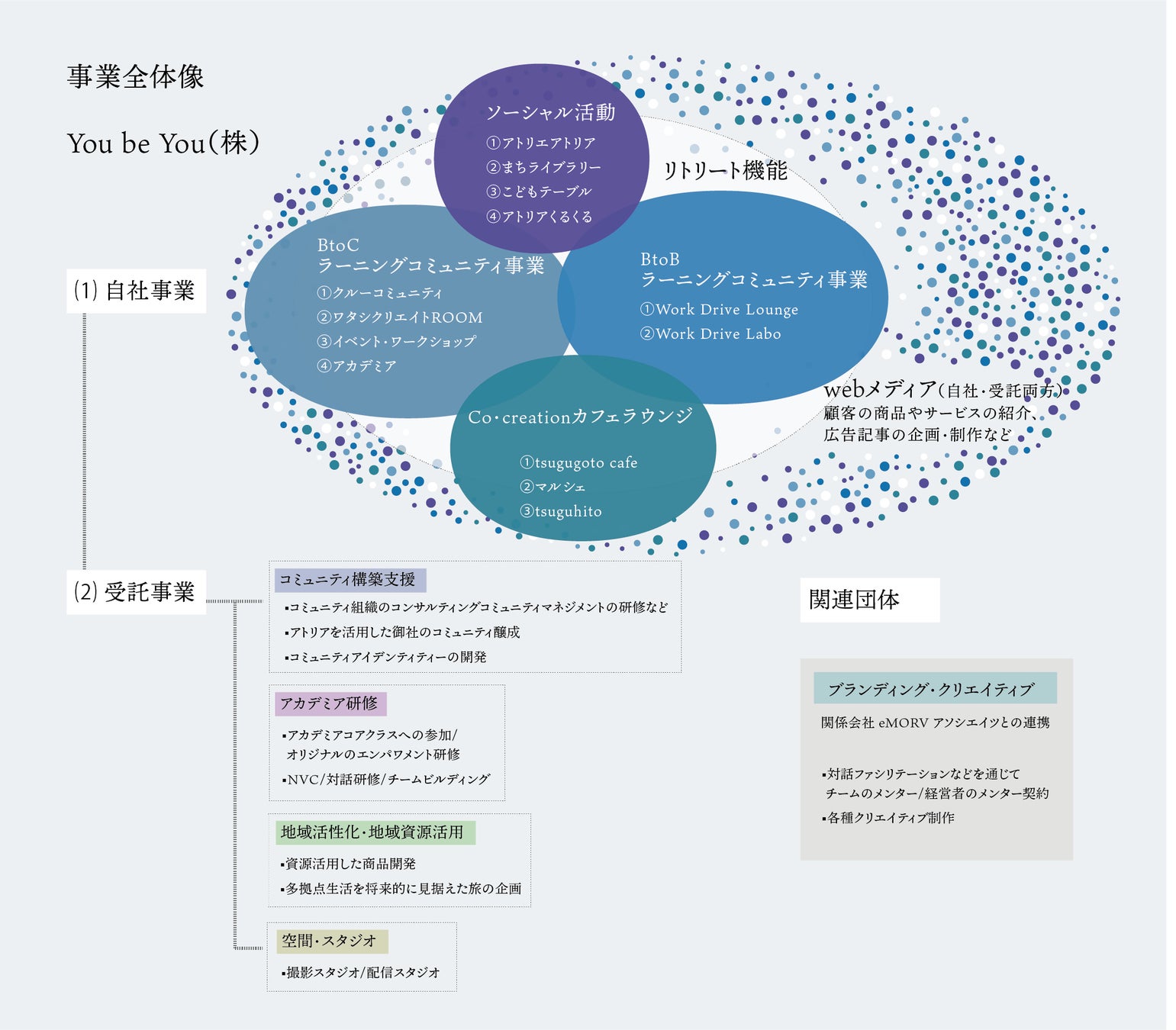 当社では、ワタシクリエイトをコンセプトに、人々が互いから学び合い成長を見守り合うコミュニティ事業をはじめ、本来の私を生きながら社会参画することを支援するアカデミア事業、日本の伝統を引き継ぎ、安心安全な食を提供する飲食事業、ワタシクリエイトな在り方を伝えるメディア事業、地域や社会に貢献するソーシャル事業等を展開しています。