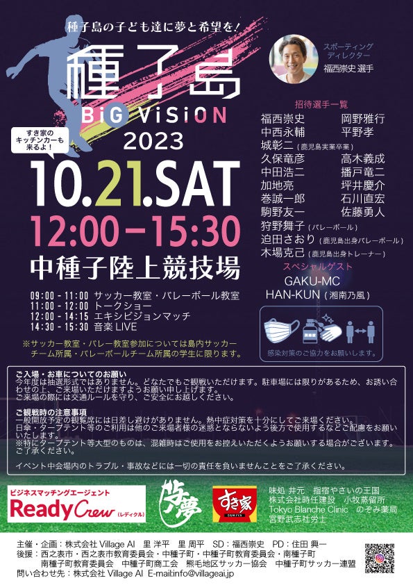 種子島に元日本代表サッカー選手15名が集結!さらにバレー選手、プロミュージシャンも!地元高校生・社会人とのチャリティーマッチ『種子島 BIG VISION』第二回開催決定!