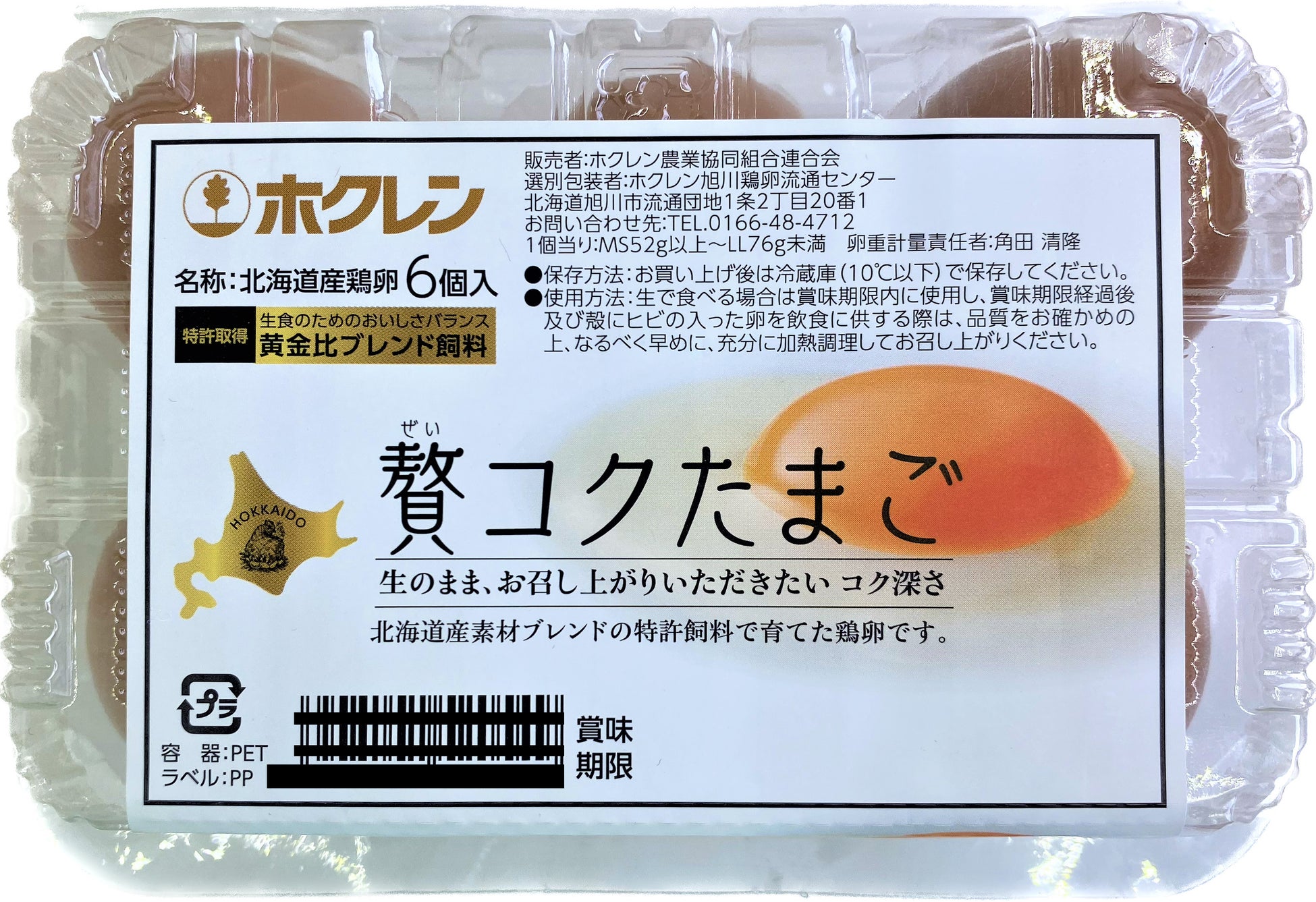 名前の由来は「贅沢感」と「コク」のある味わいのたまごの造語です。北海道産素材ブレンドの特許飼料で育てたたまごで、黄身の色が濃いのが特徴です。ぜひ生で食べて、味の違いを実感していただきたいたまごです。
