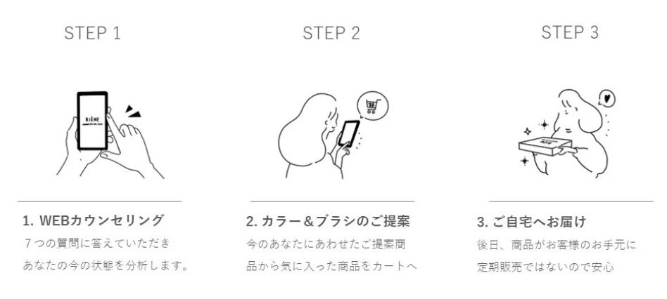 RIÈNEは、無料Web診断で肌なじみの良いカラーやブラシのサイズを提案し、その中からお客様が気に入った商品をお届けする パーソナライズネイルサービスです。