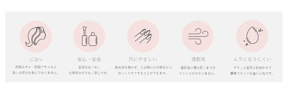 主に流通する石油溶剤ネイルポリッシュ(マニキュア)と違ってシンナー臭がなく化学成分も少ないので、爪はもちろん妊婦の方や小さいお子さま、ペットにも優しく安心してご使用できます。