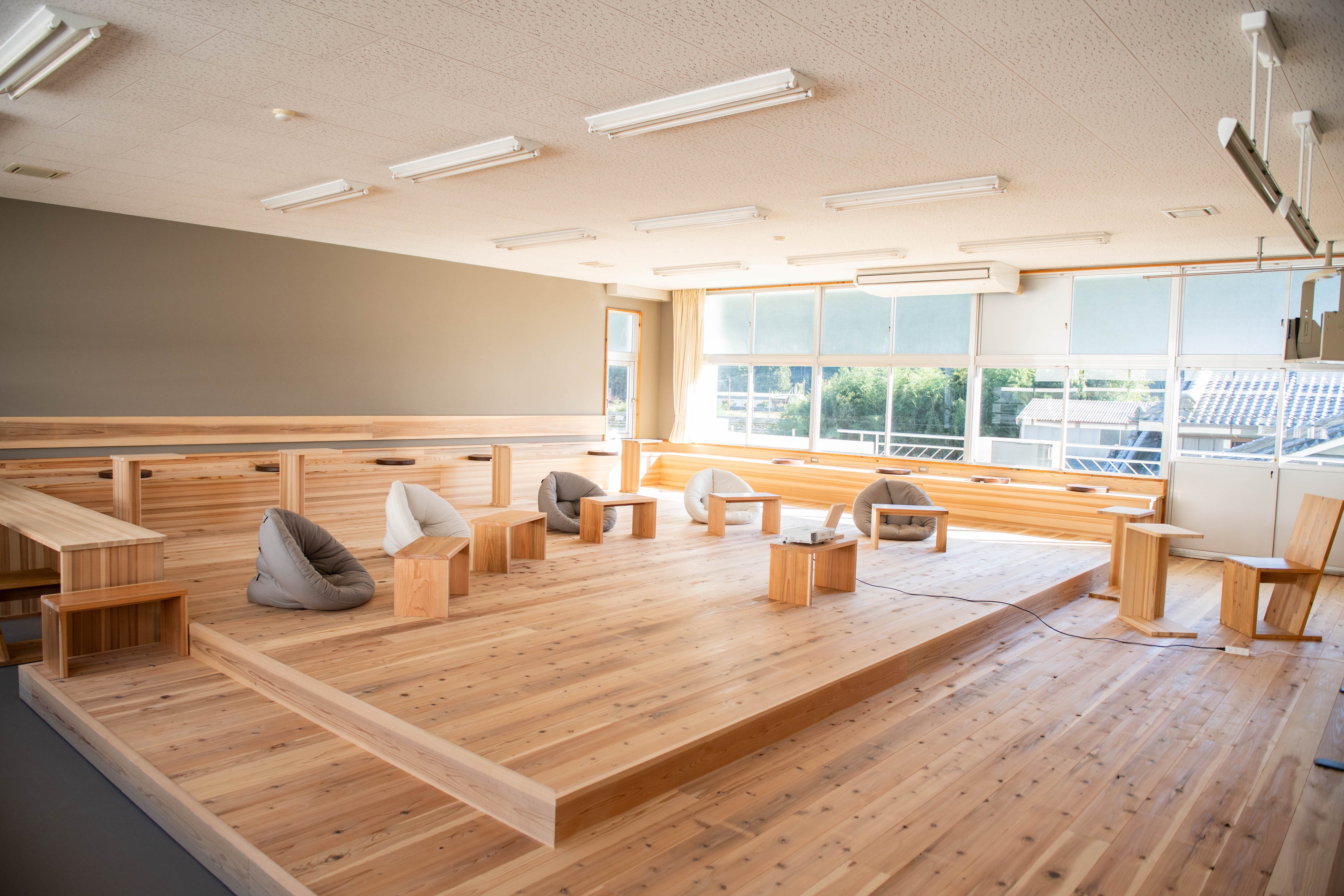 木の癒しに満ちたフィトンチッド空間が生む、リラクゼーション効果の高い研修室。杉板の床を利用して、研修・会議利用だけでなく座って行うグループワークや、各種ワークショップ、カルチャースクールも開講可能。