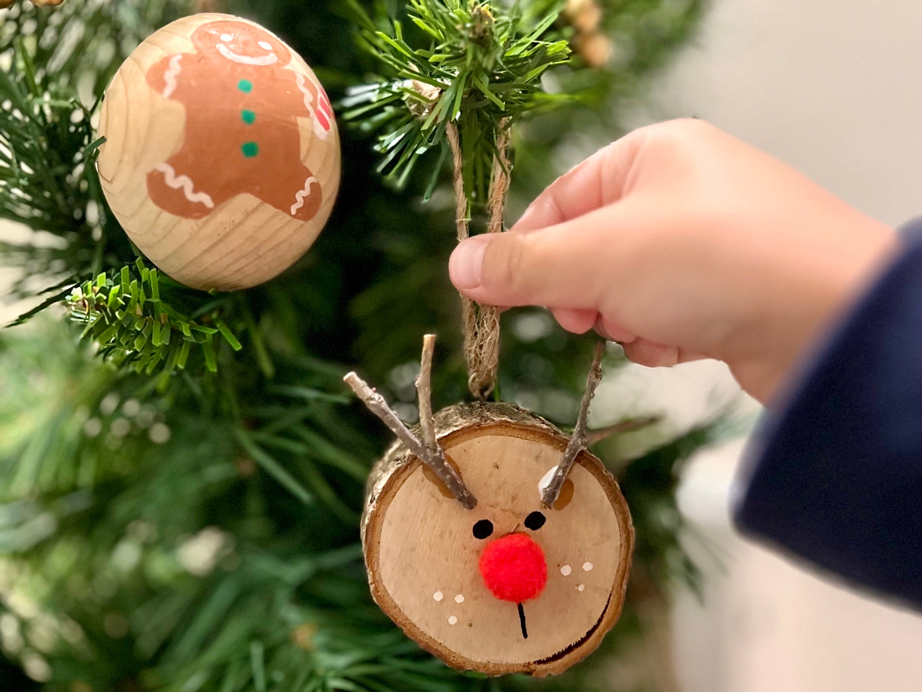 丹波産ヒノキの木球や輪切りの枝に好きな絵を描いたり、枝や葉をつけたりして、オリジナルのクリスマスオーナメントを作成。
