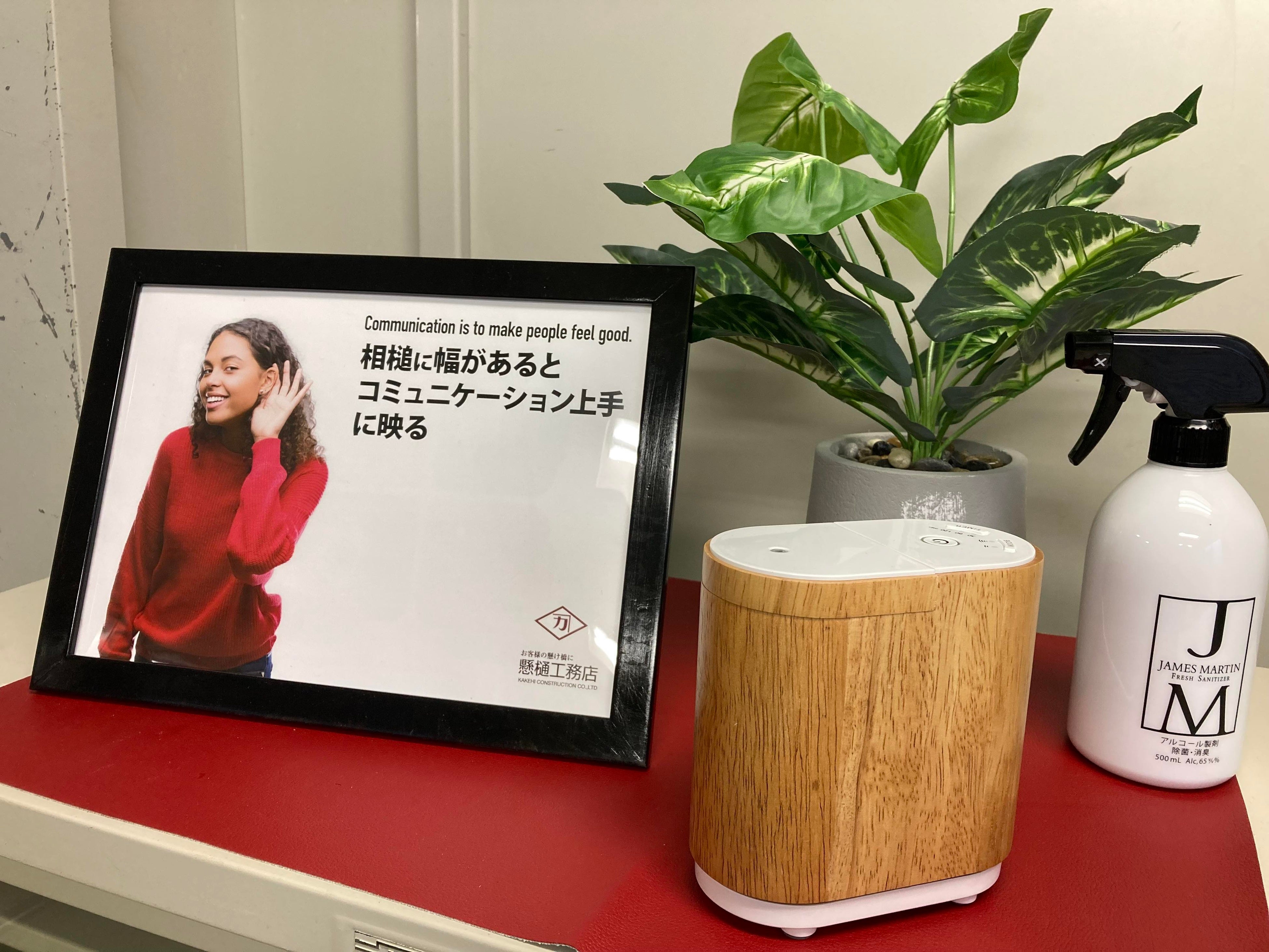 現在、人材不足は規模を問わず企業の経営課題のひとつです。建設業ではどうしてもリモートワークという働き方が難しい部門も存在します。そのため職場の“環境”に注目し、今いるスタッフにとって働きやすい職場づくりを目指すとともに、未来のスタッフの人材確保の1つとして取り組み始めました。職場環境改善のため、いくつかの企業に見学や訪問をさせてもらいました。その際、印象に残ったのがエントランスを入った瞬間の“香り”でした。おもてなしの1つという印象とともに、その企業そのものや会社の雰囲気も感じ取ることができました。香りには、リラックスしたり、集中力を高めたり多くの効果があると言われます。お客さまにはおもてなしのひとつとして、スタッフには働きやすい環境づくりのひとつとして提供したいと思いました。