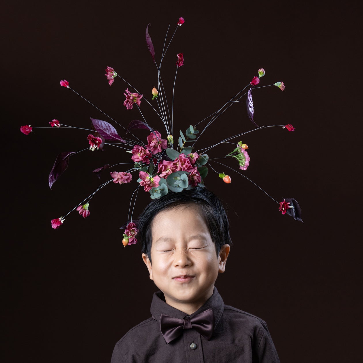 ワークショップにご参加の方は、収穫されたばかりの希少なヴィンテージブラウンやさまざまな花材を使ってオリジナルのヘアアレンジメントを制作、完成したら頭につけて「花」と「笑顔」が際立つフォトブースにて、家族や恋人、友人同士で撮影ができます。