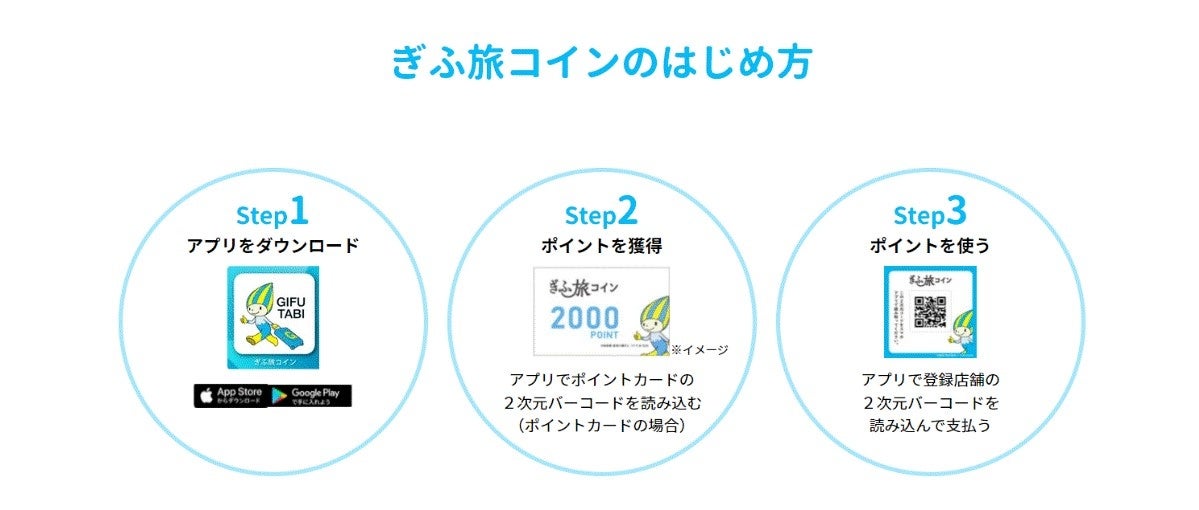 ①スマートフォンから「ぎふ旅コイン」アプリをダウンロードする。