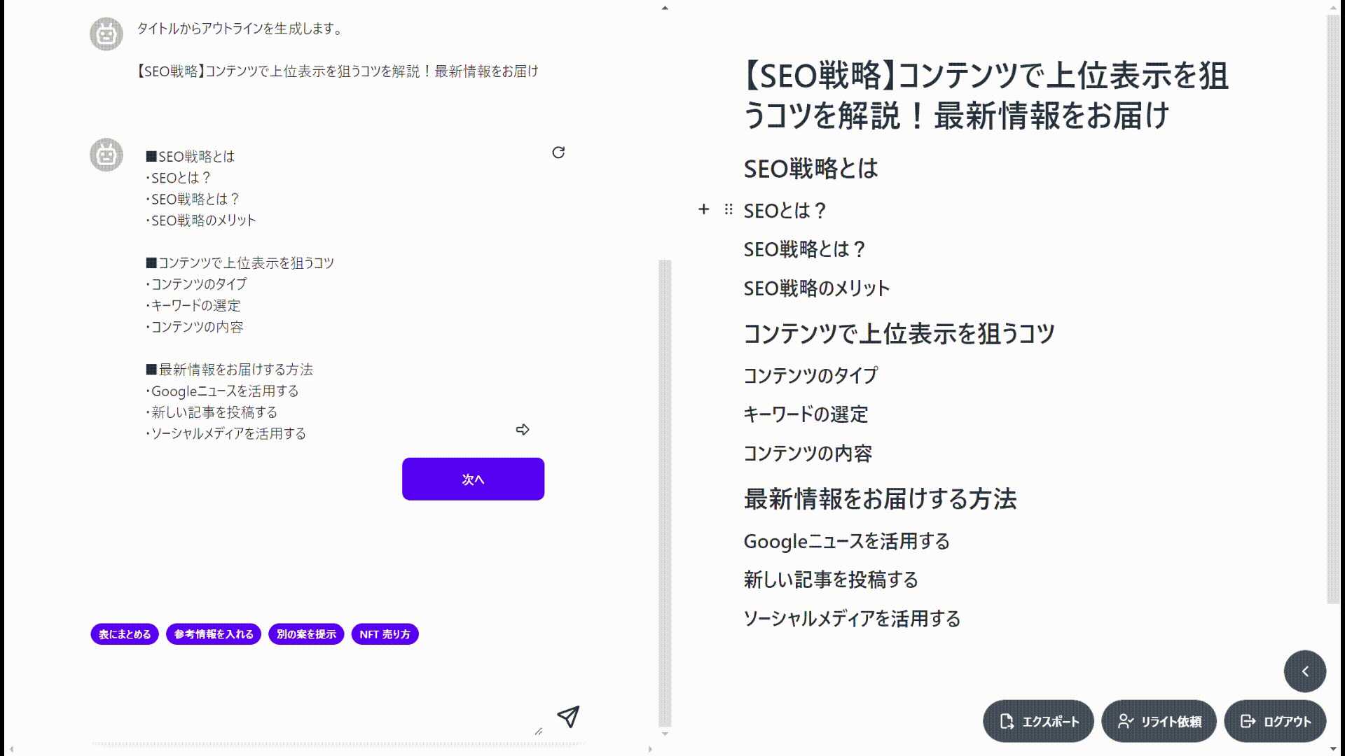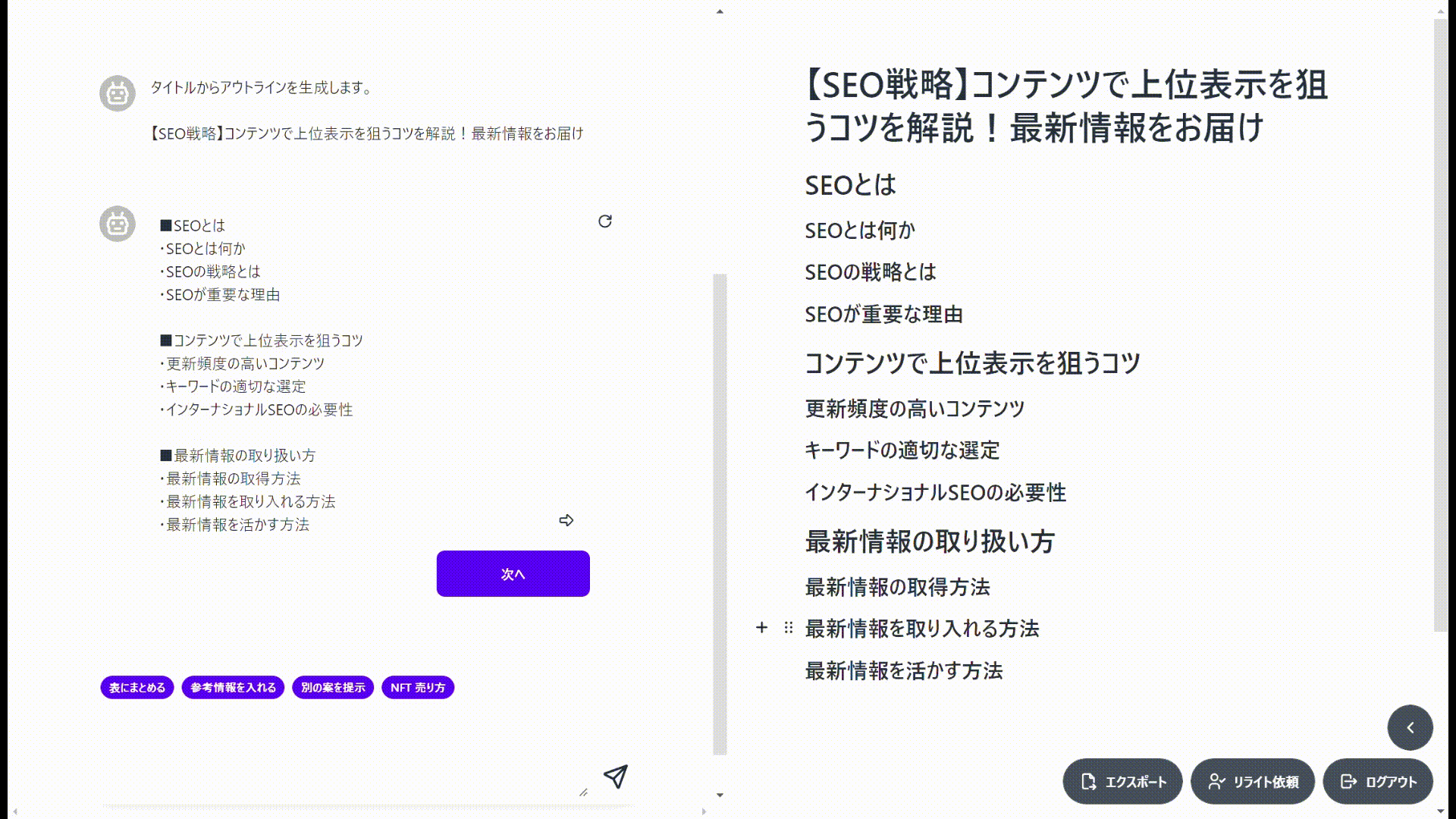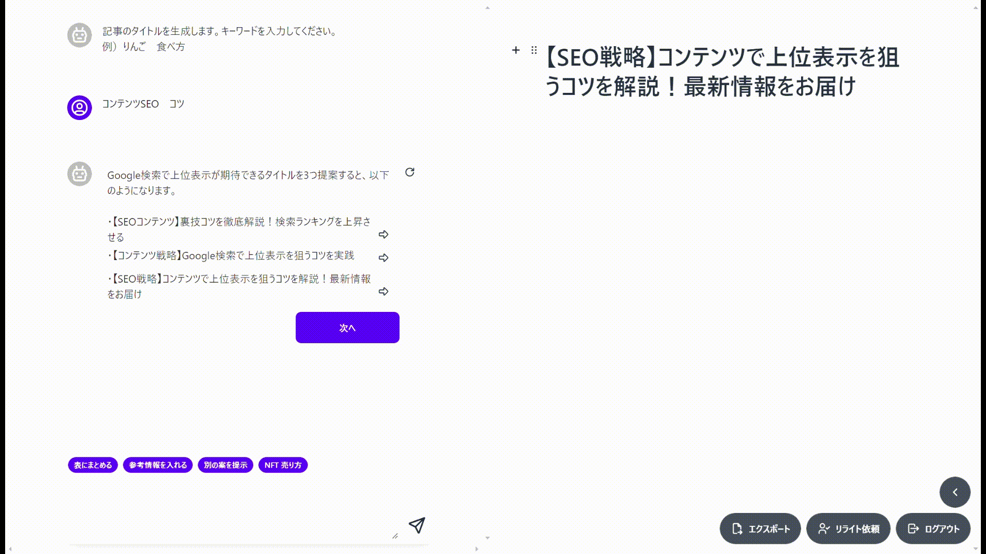 出力した文章への修正指示も可能となっており、目の前にライターがいるような感覚で文章を制作できます。
