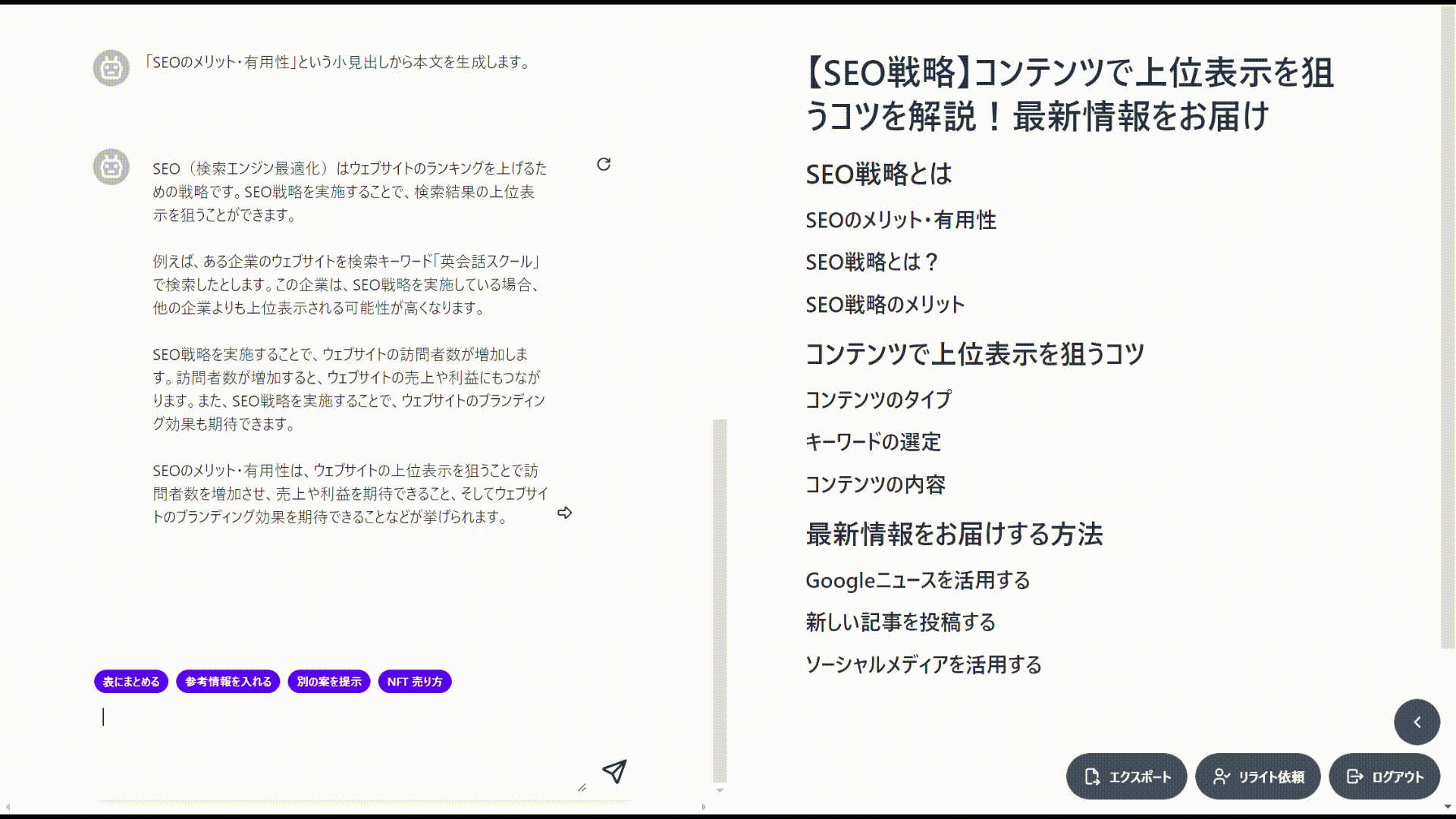 AIチャットボットのアシストにより、SEO記事の制作期間をアシストする支援ツールです。