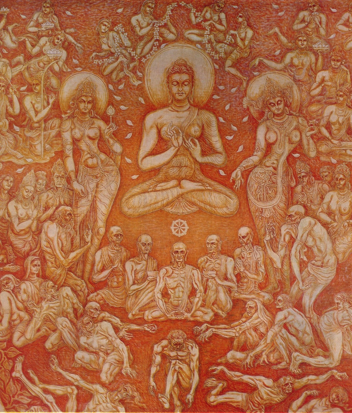 釈迦の生涯と200人にもわたる、ほぼ等身代の人物が描かれた壮大なスケールの作品です。