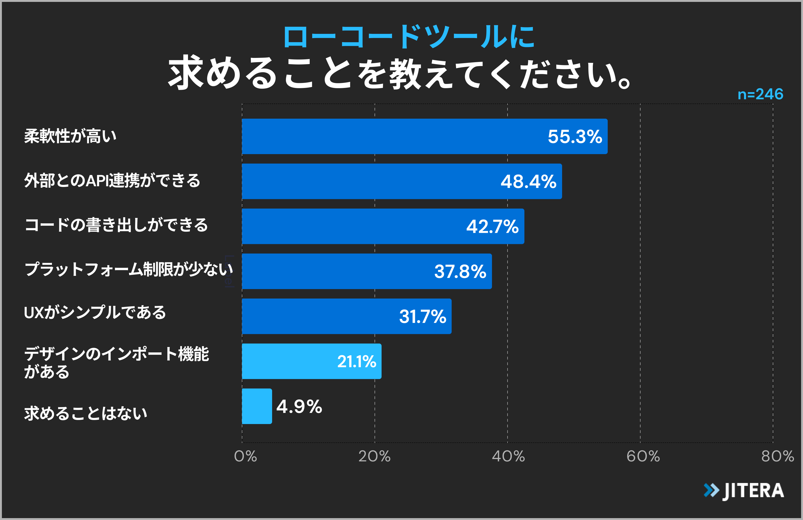 ローコードツールに求めることを尋ねたところ、「柔軟性が高い」が55.3%で最も多く、「外部とのAPI連携ができる」が48.4%、「コードの書き出しができる」が42.7%と続きました(n=246/ローコードツール利用に興味のあるエンジニア)。