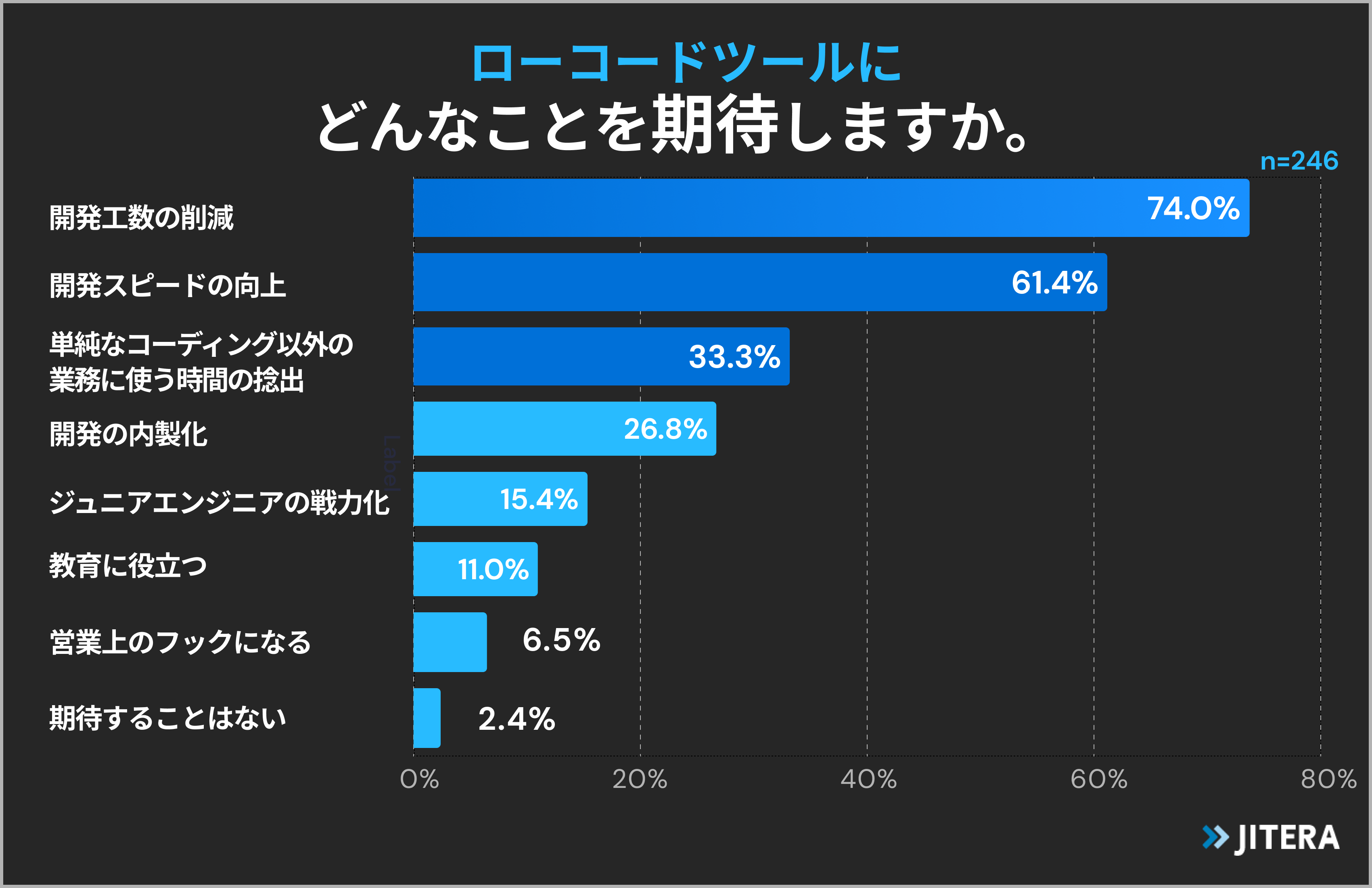 ローコードツールにどんなことを期待するか尋ねたところ、「開発工数の削減」が74.0%で最も多く、「開発スピードの向上」が61.4%と続きました(n=246/ローコードツール利用に興味のあるエンジニア)。