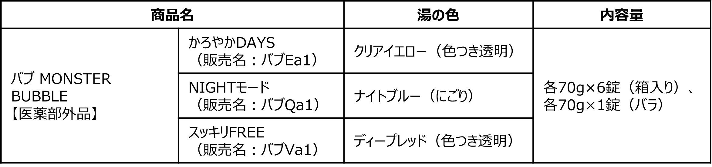 『バブ MONSTER BUBBLE』は、湧きたつような炭酸のジェット発泡で、カラダをじわじわと温めながら、気分もカラダも ほぐします(※2)。ラインアップには、温浴効果を高めて筋肉をほぐし、肩こり・腰痛に効く「かろやかDAYS」、温浴効果を高めて疲労回復、おやすみ前に疲れをほぐす「NIGHTモード」、スカっと汗をかいて温浴効果を高めて疲労回復「スッキリFREE」の3タイプを揃えています。オフロ時間の過ごし方に合わせて選べるアイテムと、オフロをもっと面白くする(※3)入浴アイデアで、楽しいバスタイムをご提案しています。
