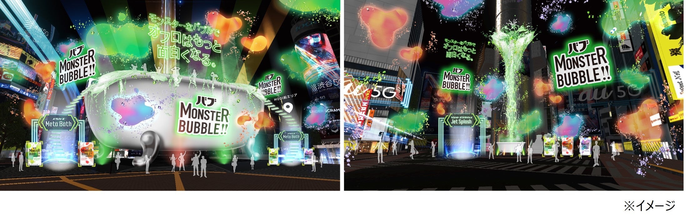 今回、『バブ MONSTER BUBBLE』を取り入れた楽しいバスタイムをより多くの方々にご提案し体験いただく活動の一環として、過去世界中から100万人が集まった「バーチャルハロウィーン」へ初めて参画。商品名やパッケージにも表れている“モンスター”にもぴったりなハロウィーン色に染まるバーチャル渋谷に、現実世界では体験することのできない、入浴にまつわる2つのコンテンツを展開します。「Meta Bath(メタバス)」は、“メタバース”空間のスクランブル交差点に巨大バスタブが出現。『バブ MONSTER BUBBLE』のお湯の色にあわせて色が変化する湯舟に浸かり、渋谷の街を一望しながら幻想的なオフロ時間を過ごせるコンテンツです。また、「Jet Splash(ジェットスプラッシュ)」では、SHIBUYA109前に設置されたバスタブからジェット発泡が噴き出し、アバターが高く打ち上げられることで上空から渋谷を見下ろせる爽快な体験をお楽しみいただけます。