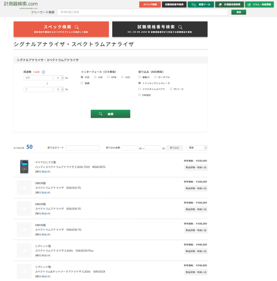 計測器検索.comは業界で一般的な検索方法に加え、エンジニアが実際に必要な、実用スペック、使用条件、機能やオプションを入力して計測器を検索する事が可能で価格情報も一目でわかる為 調査時間を大幅に削減すると共に最適な製品をピックアップする事が可能です。