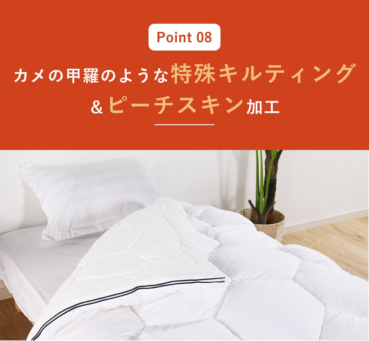 また、掛け布団と肌掛け布団でキルトの細かさが違い、重ね合わせた時に縫い目が重ならないようになっている為、暖かい空気を逃がしません。