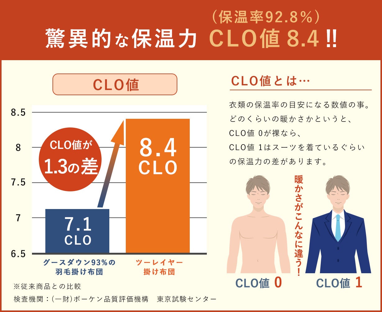 画面上では暖かさの比較が難しいと思いますので、暖かさを比較するには、保温力(CLO値)で比較していただきたいです。